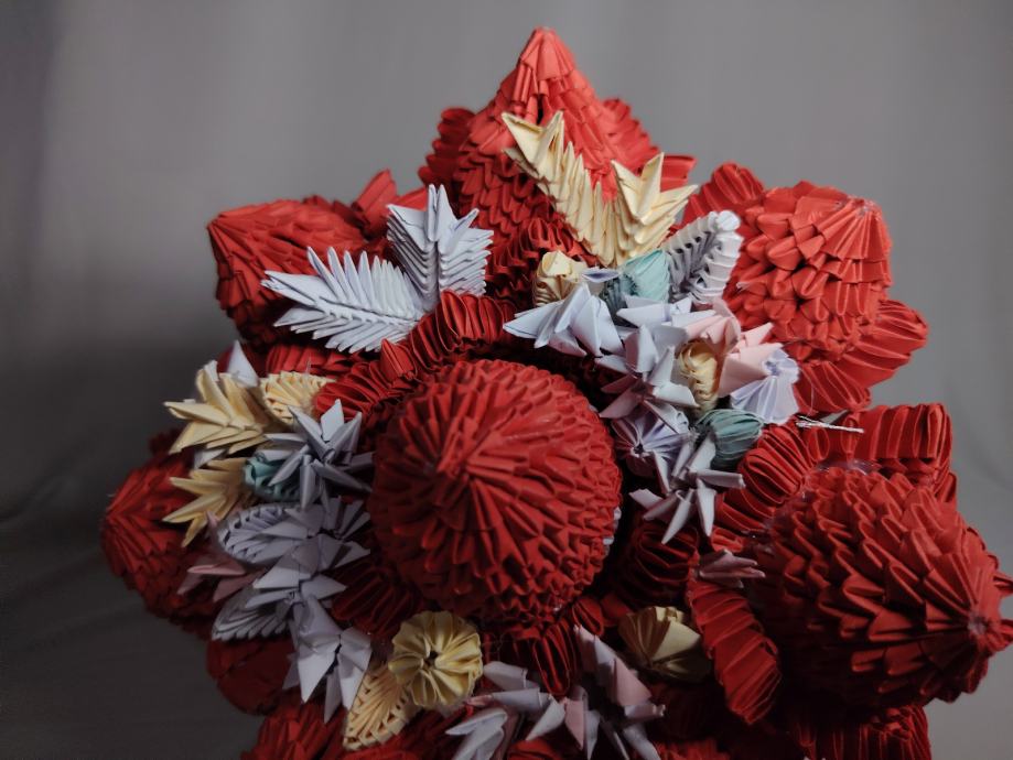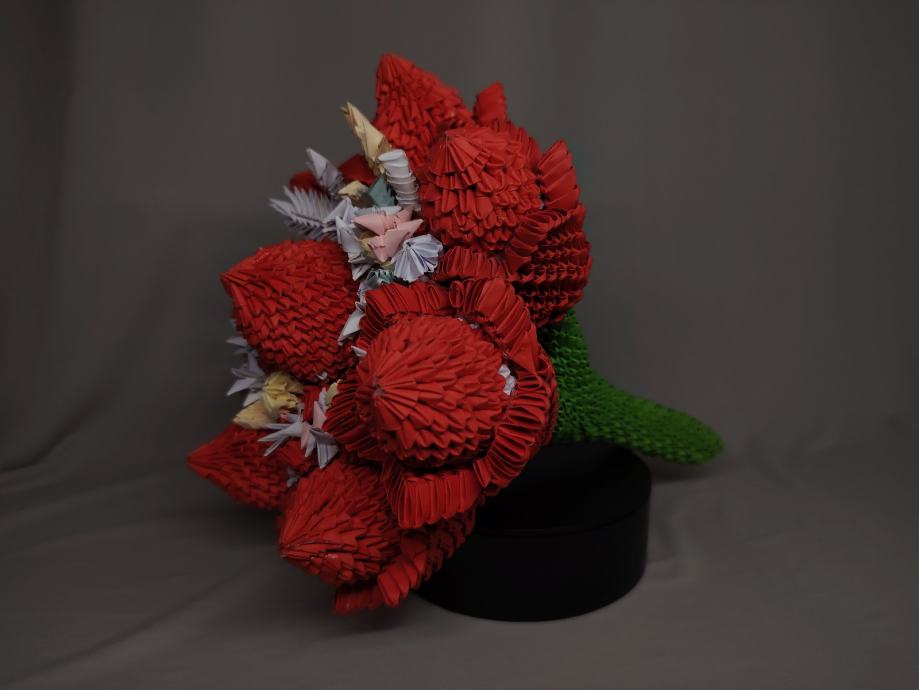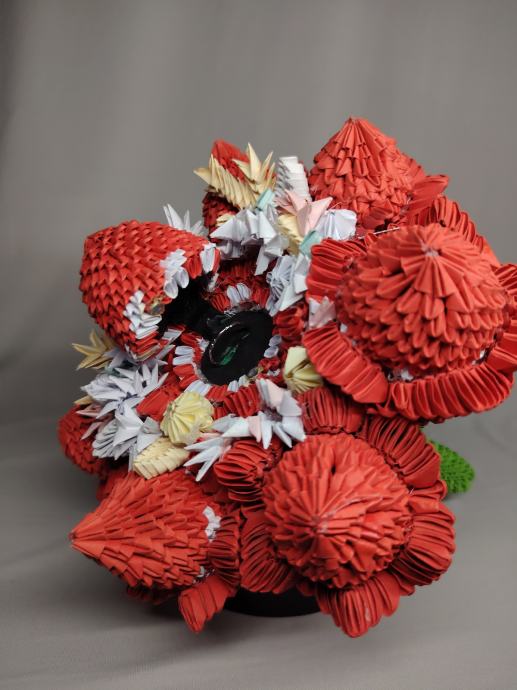 Prodajem 3D origami buket, ručno rađen od papirnih modula. Svaki element je pažljivo složen i od stotina malih papirnih trokutića koji zajedno čine voluminozne cvjetove.