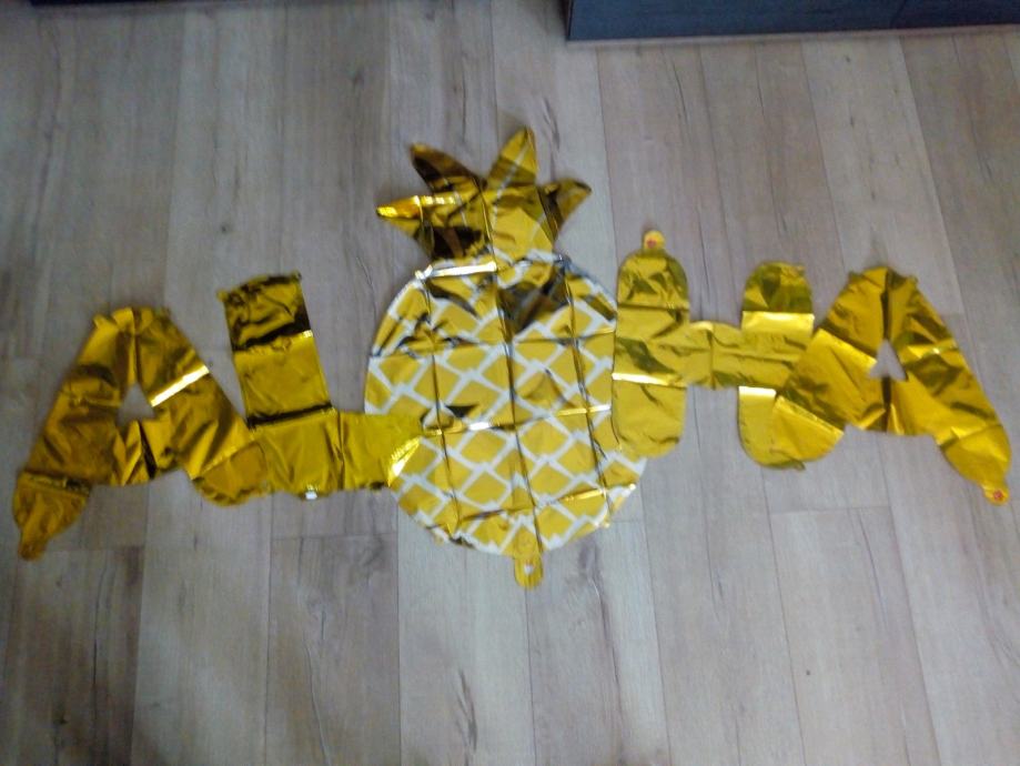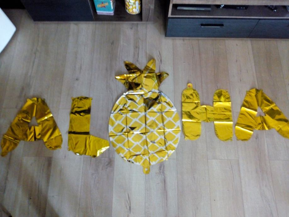 Baloni ALOHA za djevojačku večer ili rođendanski party s temom Havaja. Sastoje se od 4 balona - slova i jednog balona u obliku ananasa koji zamjenjuje slovo O. Novi, nikad korišteni. U Zagrebu i Karlovcu moguća je primopredaja. Pogledajte i ostale moje oglase, na više kupljenih stvari popust.