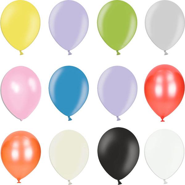Veliki jednobojni baloni izrađeni od čistog prirodnog latexa. Mogu se puniti helijem ili običnim zrakom. Promjer napuhanog balona: 30 cm. Dostupne boje: metalik crvena, pastel lila, metalik bež, metalik lila, metalik plava, metalik zelena, metalik srebrna, metalik roza, bijela, žuta, crna narančasta.