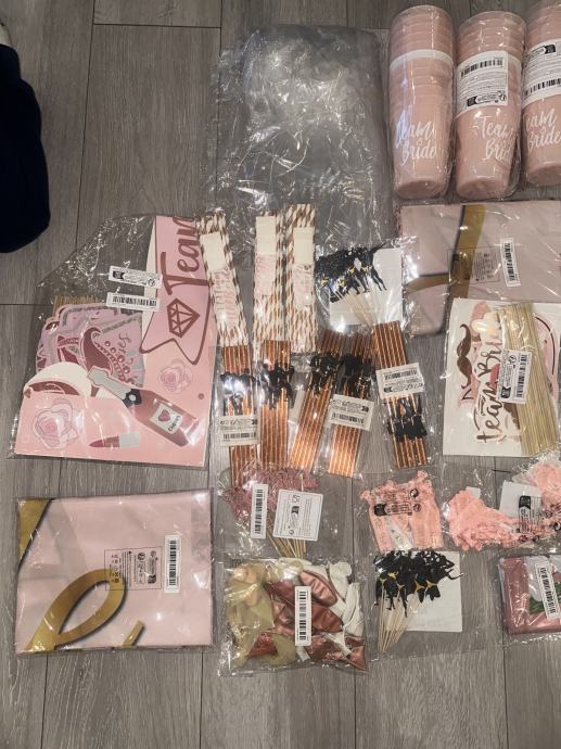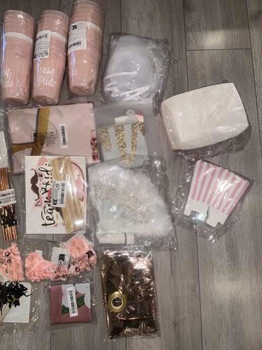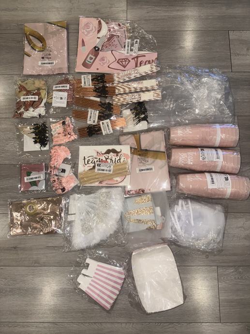 Pozdrav. Prodajem sve novo za djevojačku. Imala sam peh da mi dekoracije nisu stigle na vrijeme. (Stigle su nakon djevojačke ) tako da je sve ostalo. Imala na zalost dupli trošak. Placeno 130€. Dajem sve za 100€