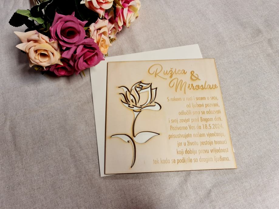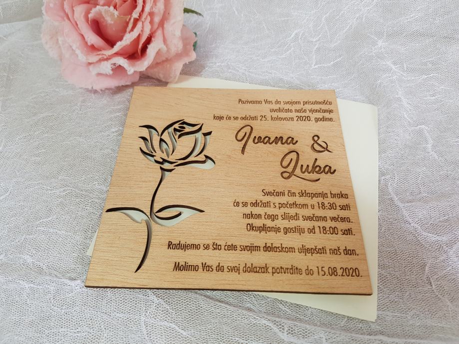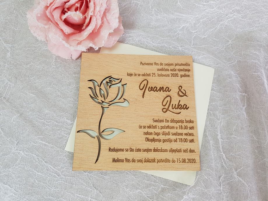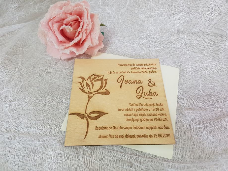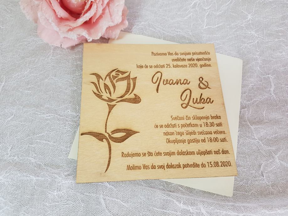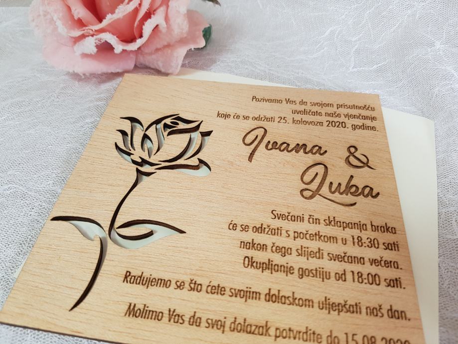 Pozivnice na slici su u dvije verzije. Ruža je sa rupom ili je ugravirana u drvo.