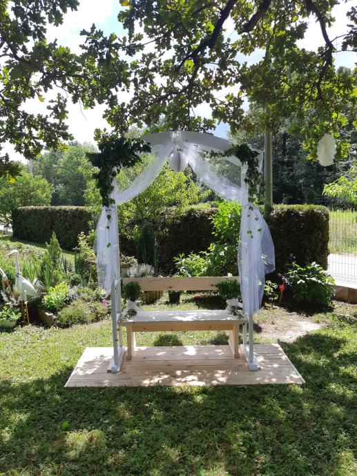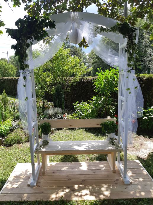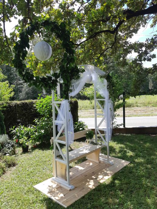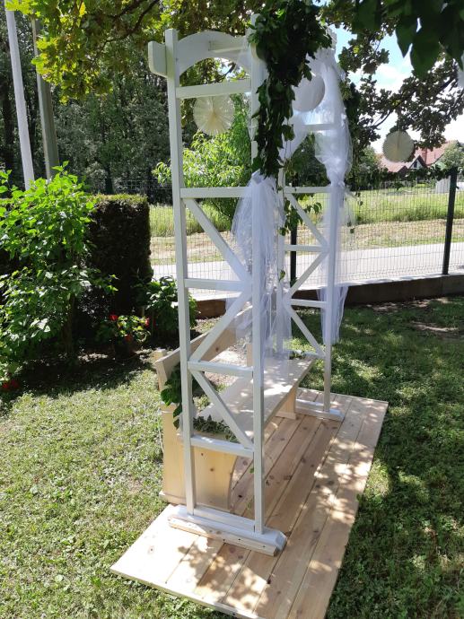 Prodaje se set od luka i drvene podloge (klupica je nedostupna). Dimenzije luka su 2.2m visina i 1.5m širina.