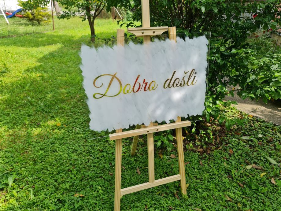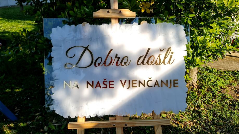 NAPOMENA: prilikom preuzimanja natpisa plaćate punu cijenu od 60€. Iznos od 35€ vam se vraća prilikom povrata neoštećenog natpisa i stalka.