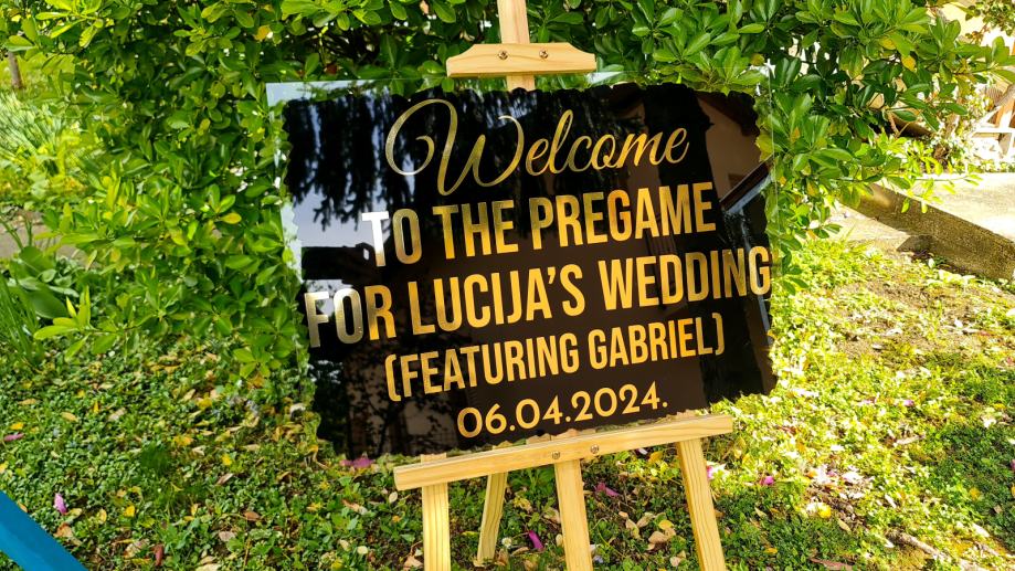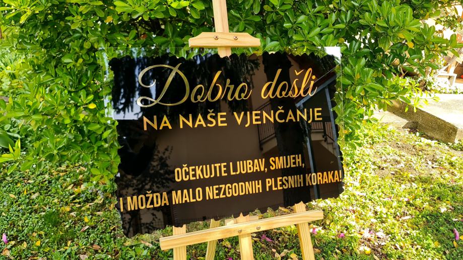 Natpis Dobro došli sa imenima mladenaca na stalku, crna verzija