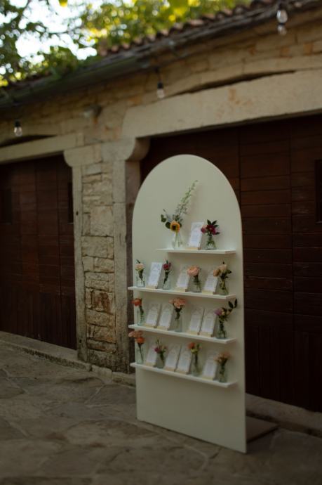 Prodajemo panel. Police su dovoljne visine da mogu poslužiti za champagne wall ili kao panel s policama za prikaz rasporeda gostiju po stolovima.