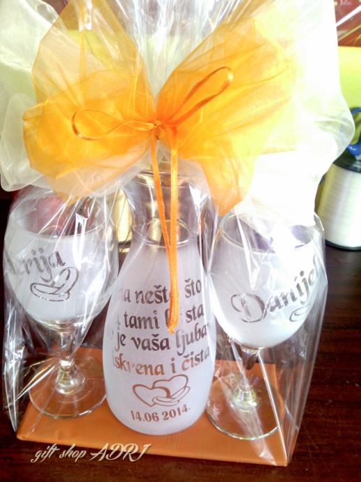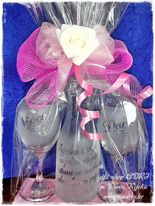 Kod ovakvog poklona postoji više varijanti izrade. Imena mladenaca mogu biti obrušena na čašama (na svaku čašu po jedno ime) uz prigodni uzorak za vjenčanje kao npr.prstenje, srca ili golubići. Dok na bokal se može obrusiti neka porukica mladencima kao i datum njihovog vjenčanja. Ukoliko želite da na bokalu stoji Vaš potpis i to je ostvarivo.