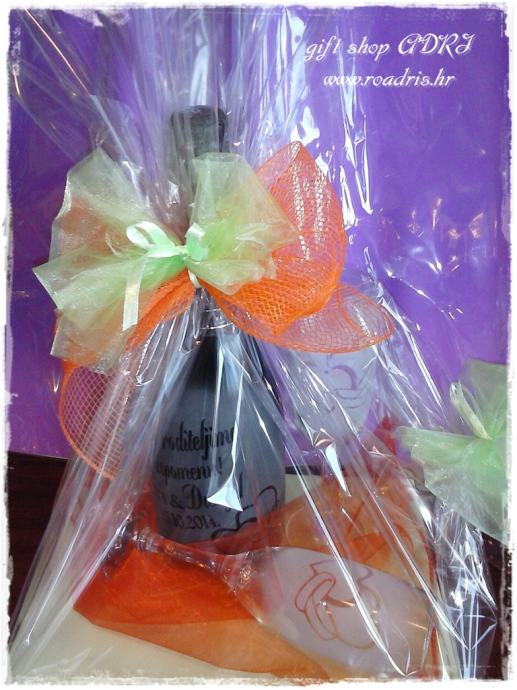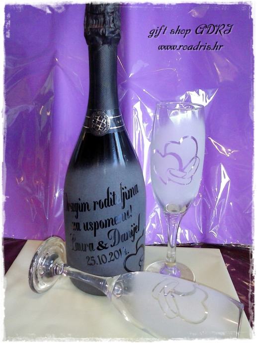 Idealan poklon za tu prigodu je boca šampanjca sa brušenom posvetom i datumom vjenčanja u kompletu sa dvije čaše za šampanjac sa obrušenim Vašim imenima ili uzorkom prigodnim za vjenčanje (prstenje, golubići, srca, mladenci...)