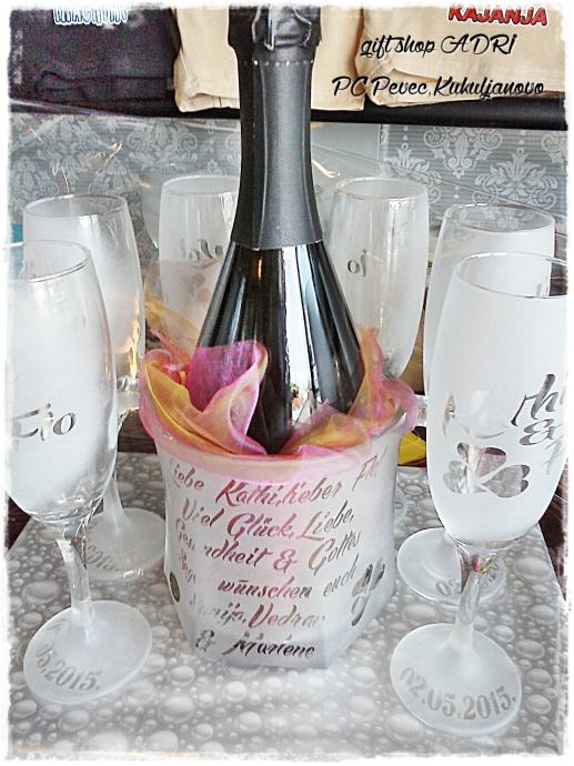 Lijep poklon može biti i komplet od 6 čaša za šampanjac sa posudom za led. Na čaše se mogu obrusiti imena mladenaca , a na posudu za led neka porukica i datum vjenčanja.