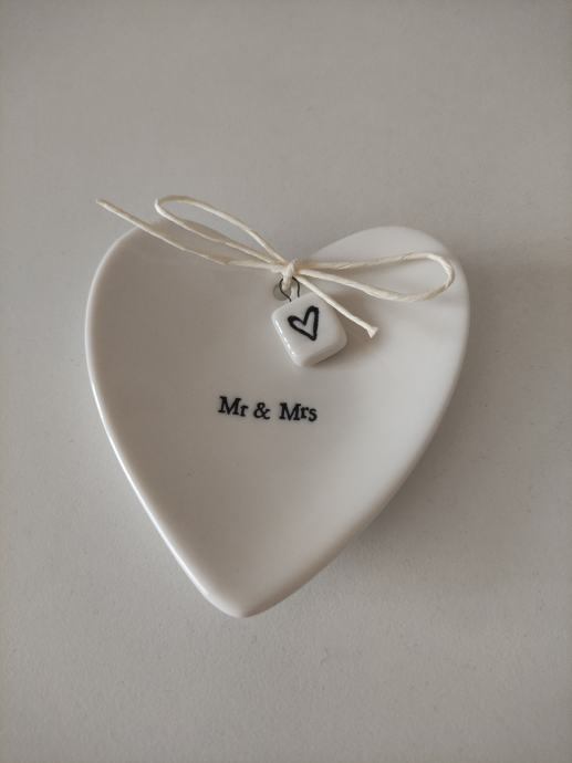 Porculanski bijeli tanjurić u obliku srca s natpisom Mr & Mrs za vjenčano prstenje.