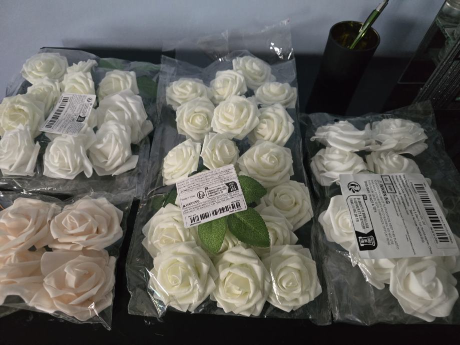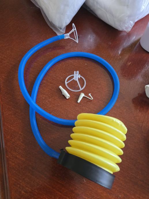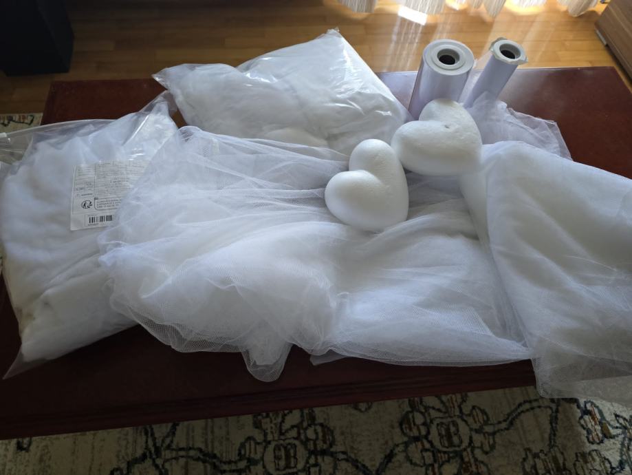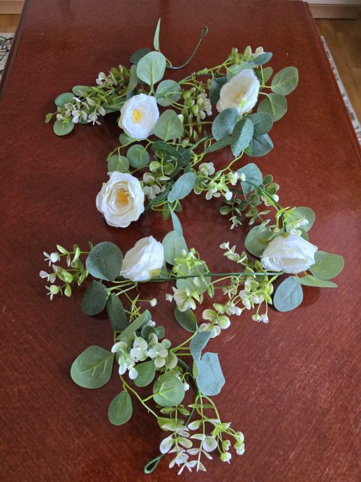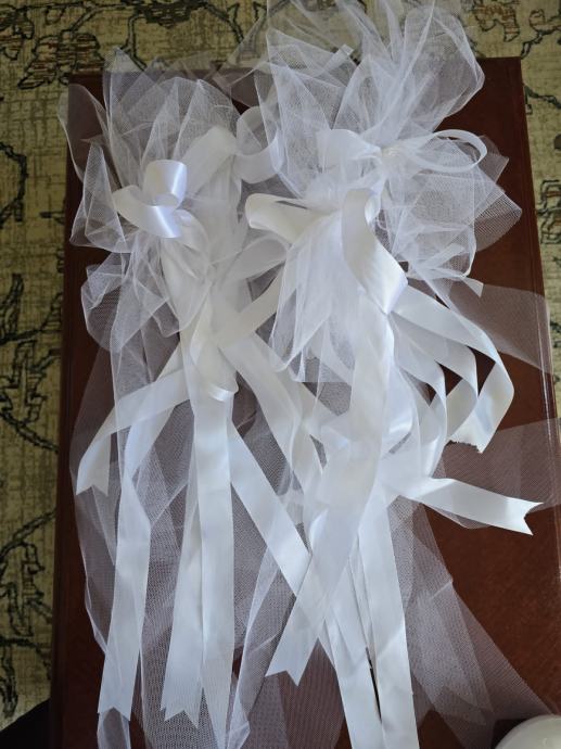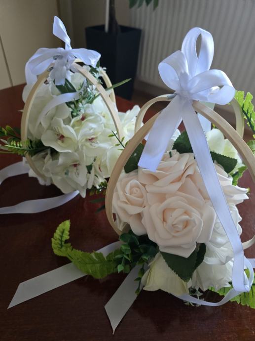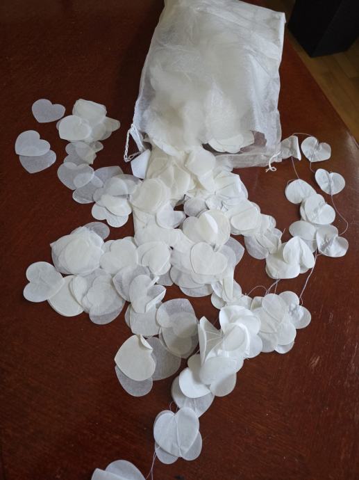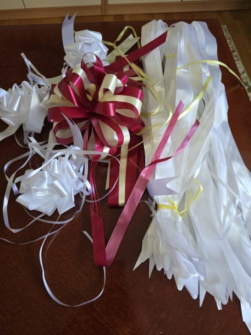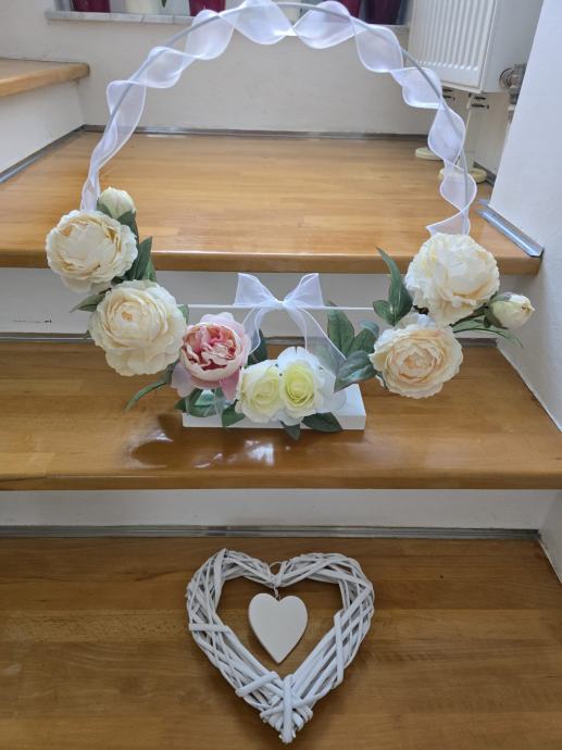 U kompletu se nalaze: 3 cvjetne dekoracije, 2 girlande od umjetnog cvijeća, 25 komada umjetnih cvjetova ruže, til u roli, trakama, mašne tila sa satenskim trakama, 2 kompleta stalka za stupove od balona, ručna pumpa za balone, crvene staze tepiha od poliestera dimenzije 160x600 - 2 komada, dekoracije u obliku srca od bijelog šiblja dimenzije 15x24 i 70x70, 25 komada mašni za ukrašavanje, papirne konfete u obliku srca 1000 kom.