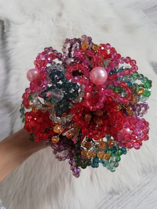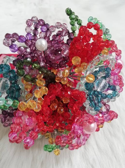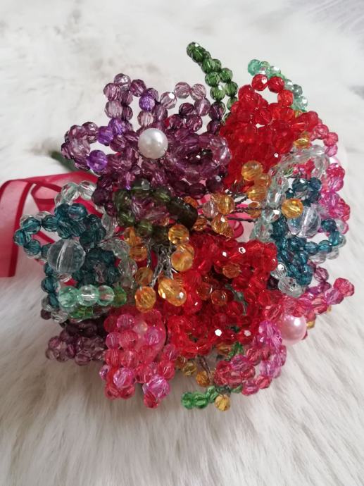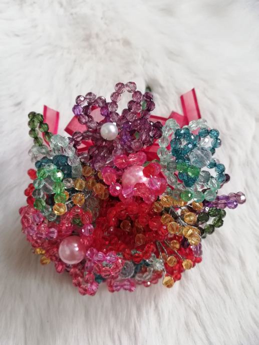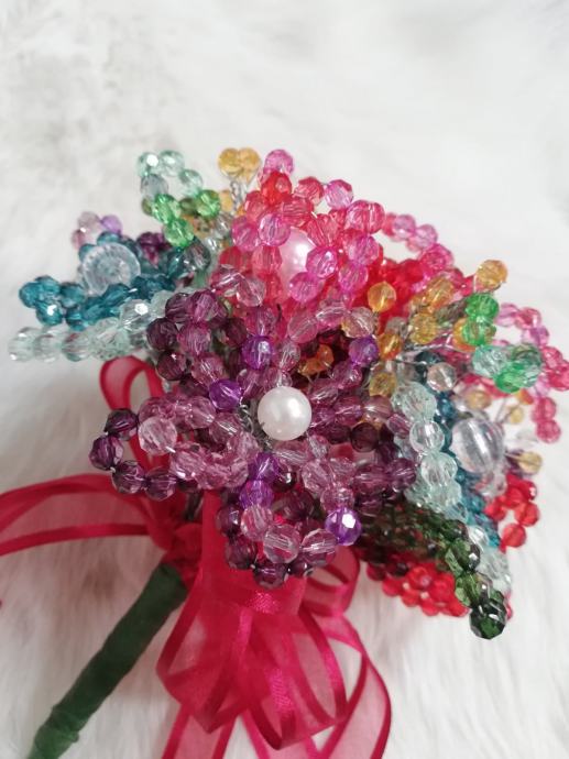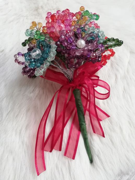 Sastoji se raznovrsnih cvjetova i ukrašen je crvenom organza vrpcom.