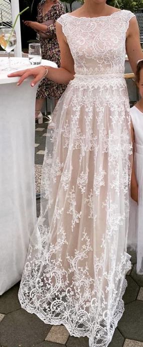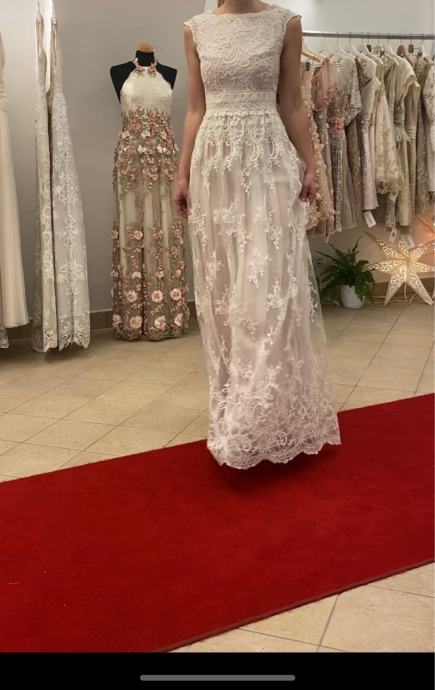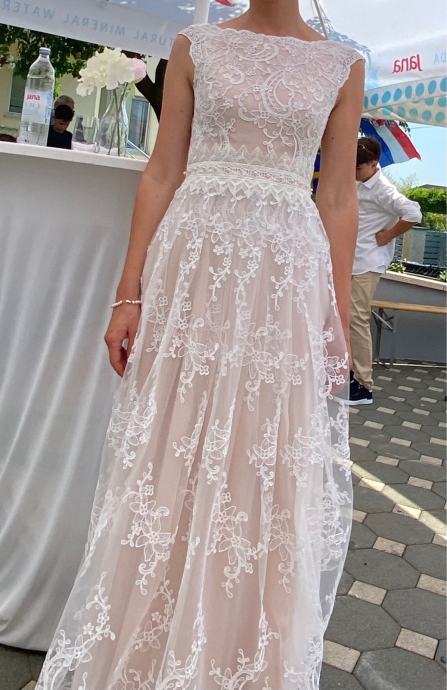 Vjenčanica unikatni ručni rad, čipka i svila. Bijelo-roskaste boje. Veličina 38/36, cca 60kg te 172 cm visine. Uz nju dolazi i bijeli šal za prekriti ramena. Odmah po vjenčanju oprana u kemijskoj čistionici. Prodajem u pola cijene od plaćene.