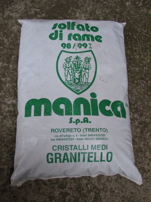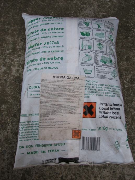 Modra galica fungicid za suzbijanje biljnih bolesti peronospore na vinovoj lozi, voću, povrću na bazi bakar-II-sulfat 25%.