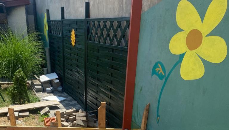 Ograda je trenutno rasklopljena, a sastoji se od tri drvena panela i četiri stupa.