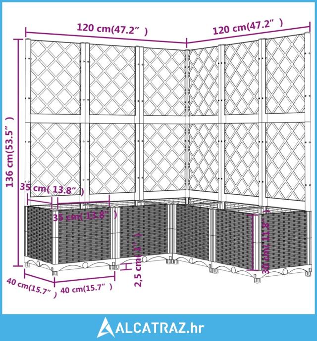 Ova sadilica napravljena je od PP-a otpornog na vremenske utjecaje, snažna i čvrsta te prikladna za vanjsku upotrebu. Donja kutija može primiti veliki broj zelenih biljaka i cvijeća. Ugrađena rešetka nudi veliku potporu za uzgoj biljaka penjačica kao što su rajčice, grašak i ruže.