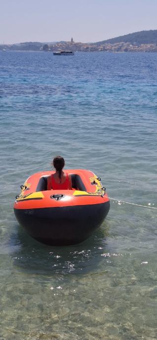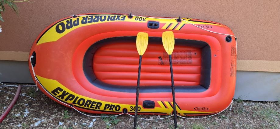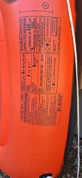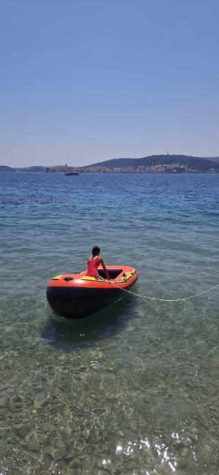 Veliki čamac na napuhavanje, očuvan. Korišten za malu djecu. Sada su djeca veća i žele kayak te je čamac suvišan. Najveći u svojoj klasi. Imate podatke o čamcu na slici.