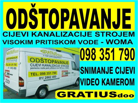 ODŠTOPAVANJE - odčepljivanje cijevi kanalizacije i odvoda strojem s visokim pritiskom vode (Woma) ili elektromotornim sajlama. Snimanje cijevi color video kamerom s automatskim mjerenjem duljine cijevi. Ispumpavanje vode iz šahtova i podruma. Gratius, Zagreb - 098/351790