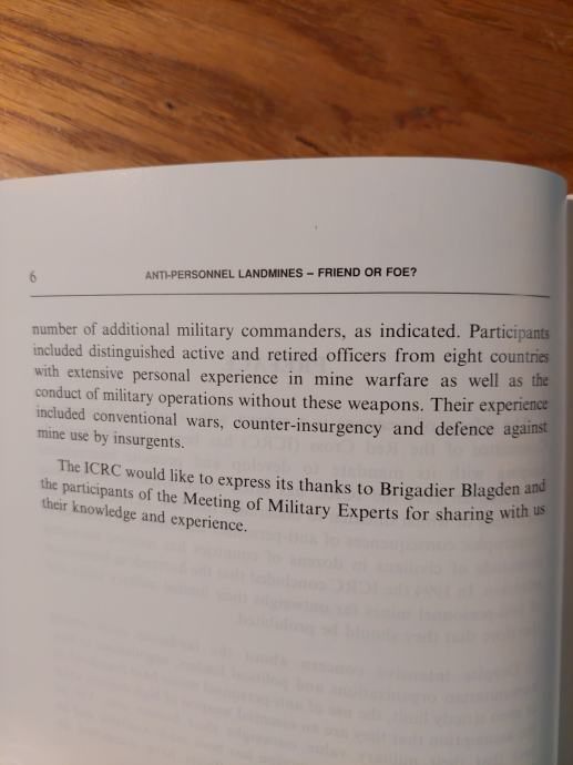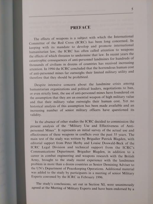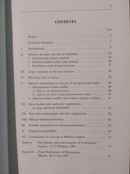 Općenito se pretpostavlja da su protupješačke mine nezamjenjivo ratno oružje i da se njihovi neselektivni učinci mogu ublažiti poštivanjem vojne doktrine i pravila međunarodnog humanitarnog prava. Ova studija ispituje vojnu argumentaciju za daljnju upotrebu ovog oružja u svjetlu njihove upotrebe u stvarnim sukobima od 1940. godine, bilo od strane profesionalnih oružanih snaga, pobunjenika ili u protupobunjeničkim operacijama. Poduzeto je u nedostatku drugih javno dostupnih studija o stvarnoj uporabi i učinkovitosti protupješačkih mina.