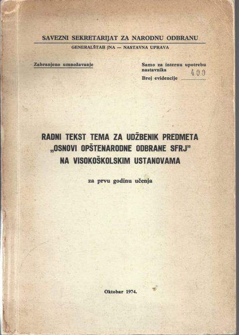 Prodajem knjigu Radni tekst tema za udžbenik predmeta "Osnovi opštenarodne odbrane SFRJ" na visokoškolskim ustanovama,