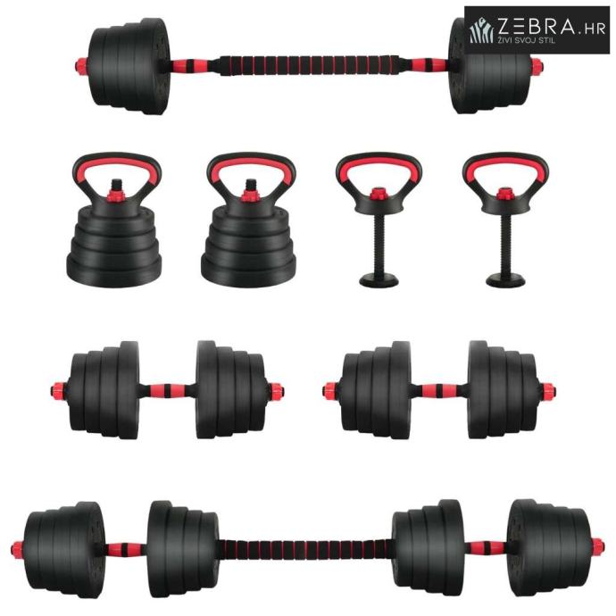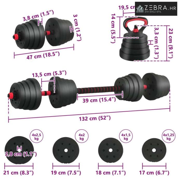 4 x ploča za dumbbell (1,25 kg): Ø17 x 3 cm (Promjer x T); 4 x ploča za dumbbell (1,5 kg): Ø18 x 3,3 cm (Promjer x T); 4 x ploča za dumbbell (2 kg): Ø19 x 3,8 cm (Promjer x T); 4 x ploča za dumbbell (2,5 kg): Ø21 x 3,8 cm (Promjer x T); 2 x šipke za dumbbell (0,27 kg): Ø2,5 x 51 cm (Promjer x L); 1 x cijev za povezivanje s utegom: Ø4,15 x 39,5 cm (Promjer x L); 4 x velike zvjezdaste brave; 2 x držač za kettlebell: 19,5 x 14 cm (D x Š); 2 x baza za kettlebell: Ø9,35 x 22 cm (Promjer x Š)