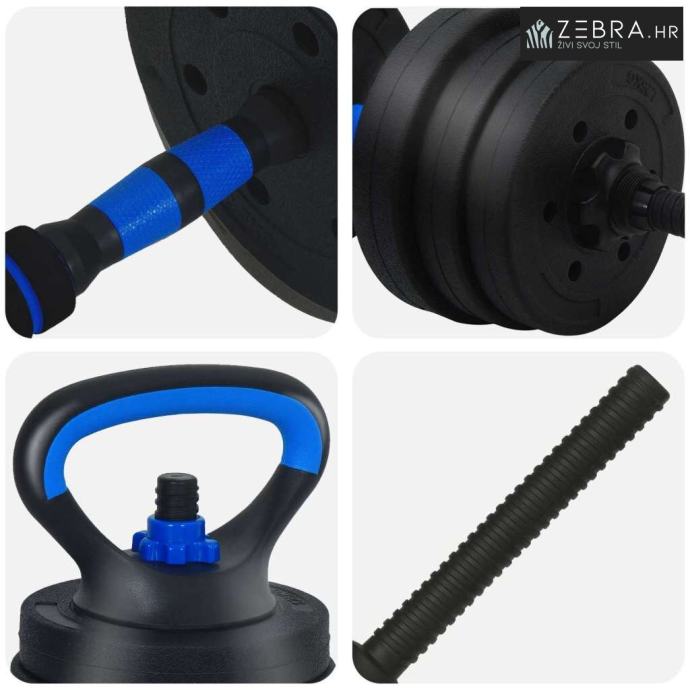 4 ×utezna ploča : Ø17 ×3 cm ; 4 ×utezna ploča : Ø18 ×3,3 cm ; 4 ×utezna ploča : Ø19,5 ×3,8 cm ; 2 ךipke za bučice : Ø2,5 ×47 cm ; 1 ×spojna cijev: Ø4,15 ×39,5 cm ; 4 ×veliki zvjezdasti zatvarači; 2 ×rukohvat kettlebell: 19,5 ×14 cm ; 2 ×baza kettlebella: Ø9,35 ×22 cm