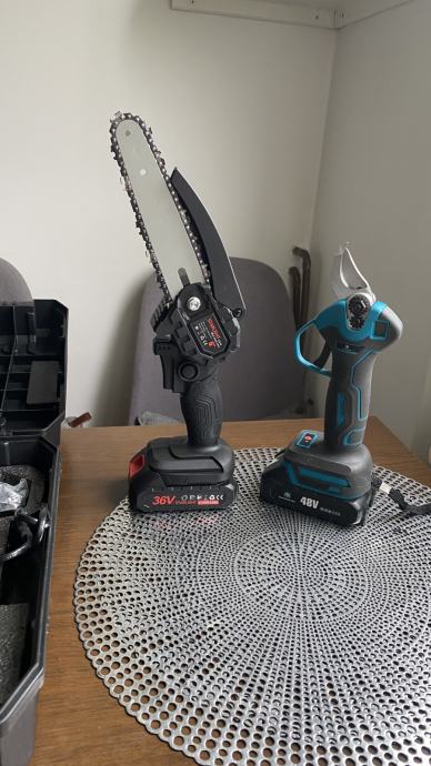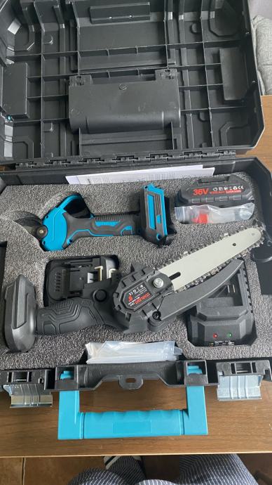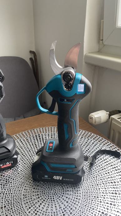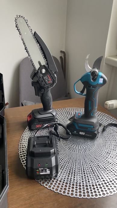 Aku škare sa brojačem rezova i aku pila +punjač,dvije baterije,rezervni mač za pilu,rezervni nož za škare i alat za montažu.