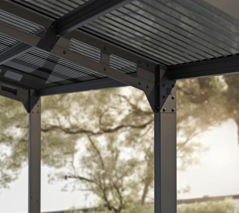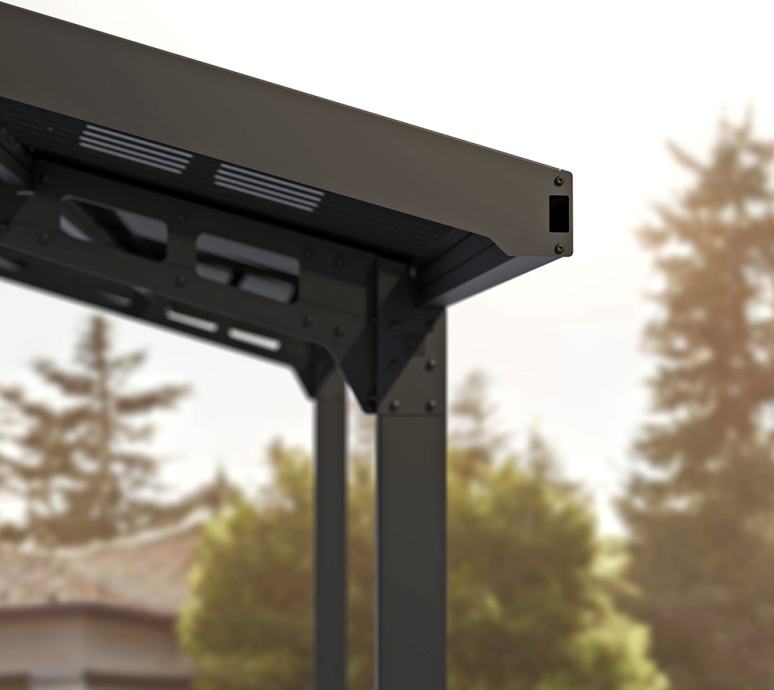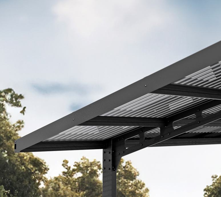 Model Sydney Apex stoji na 4 noge poput klasičnog nadstrešnice za automobil, no crna aluminijska konstrukcija čini ga vrlo prozračnim i nekonvencionalnim. Aluminijska konstrukcija prekrivena je dvovodnim krovom od 100% UV-otpornih sivih polikarbonatnih krovnih ploča koje lako podnose utjecaje vremenskih uvjeta. Zahvaljujući inovativnom sustavu spajanja panela i profila, Sydney nadstrešnica tvrtke Palmar - Canopia se brzo i jednostavno postavlja.