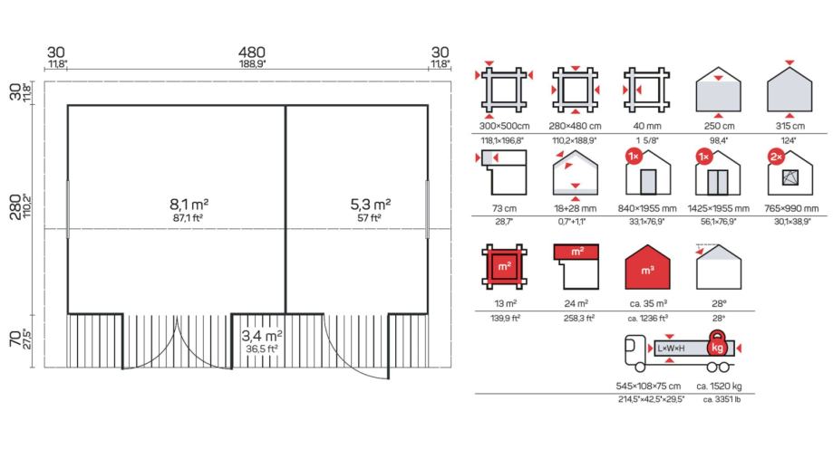 Dimenzije zidova (širina x dužina): 280 x 480 cm