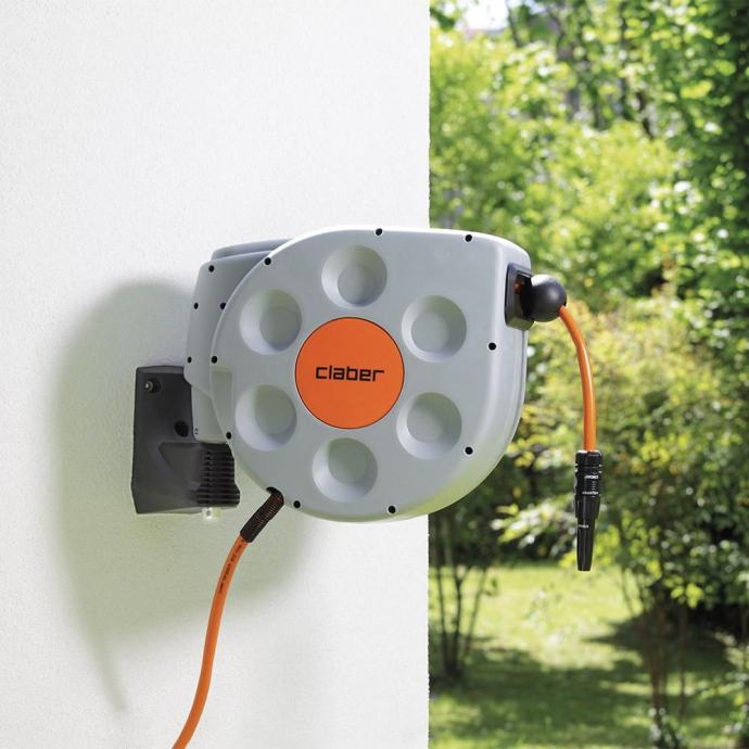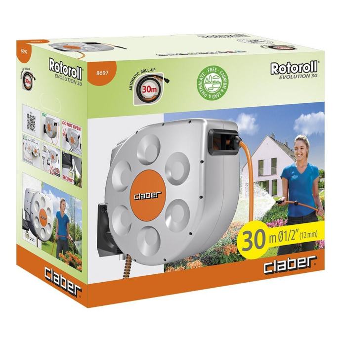 Automatske motalice - CLABER ROTOROLL EVOLUTION. Motalica za crijevo s mehanizmom za automatsko premotavanje za sigurnu i jednostavnu upotrebu. Spreman za korištenje s 30 m posebnog nedeformabilnog crijeva - površina protiv trenja za glatko i brzo premotavanje. Otporan na hrđu. Opremljen produžnim crijevom za spajanje na slavinu duljine 2 m, 3/4' (20-27 mm) priključkom za slavinu, automatskim spojnicama i mlaznicom za prskanje. Originalan u dizajnu i tehnologiji, inovativan u udobnosti i sigurnosti korištenja. Može se montirati na zid ili bilo gdje u vrtu.