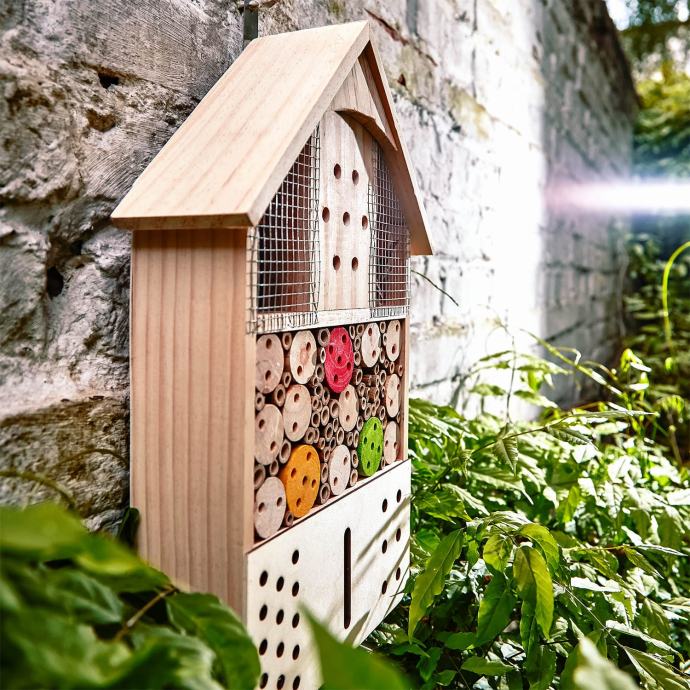S kućicom za insekte iz blumfeldta možete učiniti puno dobra - za sebe, za svoj vrt i za okoliš! Ručno izrađeni hotel za korisne insekte s brojnim šupljinama čarobno privlači pčele, kornjaše i muhe i pruža im utočište dobrodošlice tijekom cijele godine. Gledajte kako insekti ulijeću i izlaze i pustite svoj vrt da oživi!Naš će se hotel za pčele dokazati gdje god želite insektima ponuditi pogodna mjesta za gniježđenje i zimovanje. Neka bruje u vrtu, na polju, u šumi i na livadi!Ručno izrađena kuća ima mnogo šupljina u drvu, a uz to i brojne bambusove cijevi, koje su se pokazale mjestima za gniježđenje i spavanje pčela. Postoje i dvije komore koje su ispunjene borovim šišarkama i komadima drveta - one privlače uglavnom muhe i kornjaše! U sredini donjeg dijela nalazi se kućica leptira koja insektima nudi prikladno utočište i vrlo dobrodošla zimovališta.Hotel za divlje pčele prekrasan je upada u oči, originalna ideja za poklone i izvrsna prilika za promatranje djece i ljubitelja prirode. Dobro posjećena kućica za insekte također ima značajne koristi za vaš vrt: njezini mali stanovnici naporno rade na oprašivanju vaših voćaka i cvijeća!Objesite hotel za insekte blumfeldt vani, na mjestu zaštićenom od kiše (npr. Ispod prevjesa krova) i ostavite ga na mjestu tijekom cijele godine. Pčele vole toplinu i sunce - otjerao bi ih vjetar i vlaga. Stoga usmjerite kućicu za insekte prema jugu ili jugoistoku i pričvrstite je na visini većoj od 50 cm. Hotelu za insekte potrebna je besplatna pista i brojne biljke u blizini.