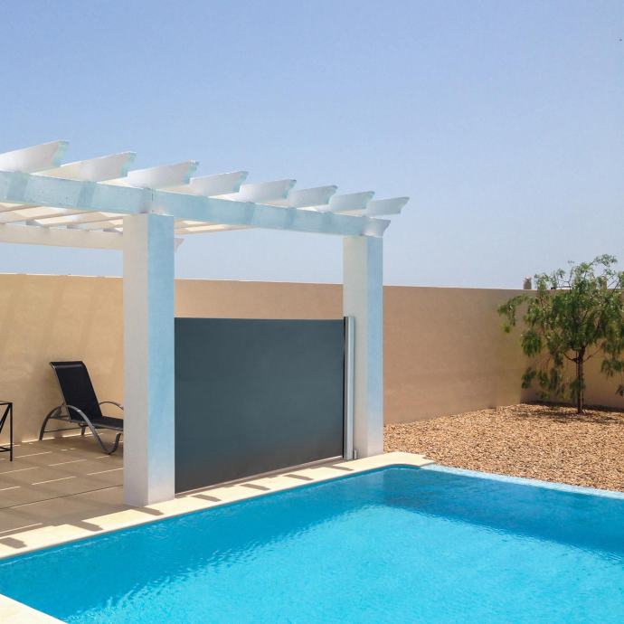 Izrađen od izdržljivog aluminija kombiniranog s otpornom poliesterskom tkaninom s PA premazom, naš zastor za privatnost stabilan je, otporan na vremenske utjecaje i UV-zračenje Jednostavno izvucite potpuno uvlačiv zastor do punog produženja od 1,5 metara. Nakon uporabe zastor se automatski vraća u svoju kutiju. Zahvaljujući posebno dizajniranom zidnom nosaču, ovaj vjetrobran može se postaviti i vodoravno i okomito. Jednostavnim pokretom zastor se može skinuti s nosača.