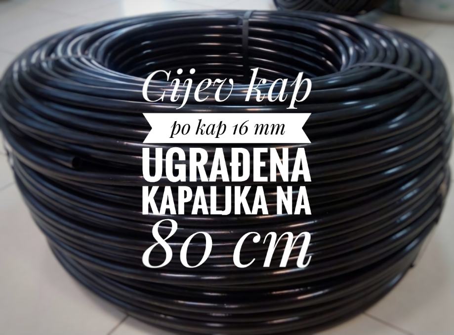 Polietilenska cijev vanjskog promjera 16 mm, debljina stjenke 1,1 mm razmak kapaljki na svakih 80 cm.Kapacitet protoka kapaljke 2 l/h.Radni tlak do 3,5 baraUV stabilne, otporne na sunce i ostale vremenske uvjete .Preporuka koristiti filter za vodu od 100-120 mikrona.Cijevi rade na tlaku do 3,50 bara (vodovod, hidrofor,pumpa ) , također se koriste kod navodnjavanja slobodnim padom ( spremnicima za vodu, cisterne,…)Namjena: koriste se za navodnjavanje povtnjaka, višegodišnjih trajnih nasada,voćnjaka(vinograd,maline,kupine,haskap,…), živica, cvijetnjaka. Gusti razmak kapaljki omoguće ravnomjernu i brzu distribuciju vode i za gusto posađene povrtlaske kulture.Upotrebom višegodišnjih kvalitetnijih cijevi izbjegavamo nepotrebno stvaranje otpada (jednogodišnje tape cijevi koristimo jednu sezonu).Uz pravilno održavanje cijevi se mogu koristiti dugi niz godina ,na kraju svake sezone ih možete spremiti (ukoliko se radi o manjem vrtu) ili ih jednostavno možete ostaviti na otvorenom bez straha od oštećenja. Nakon sezone ukoliko cijevi ostaju na otvorenom potrebno je ispustiti vodu iz cijevi