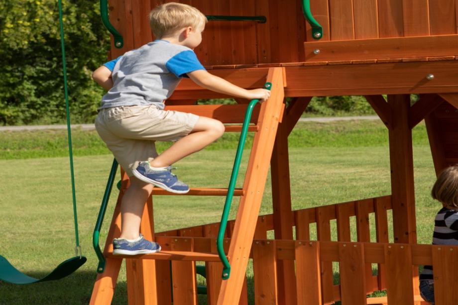 Prednosti:Ovo igralište potiče dječju maštu! Um mališana lako ga pretvara u brod za vrijeme oluje, dvorac pun vitezova i dvorskih dama ili slatki kafić. Opremljena je natkrivenom blagovaonicom (sa stolom i klupama) i zvjezdarnicom s teleskopom. Glavni dio građevine je kula s malim trijemom, prozorima i dvovodnim krovom. Ovaj model također ima ljestve, zid za penjanje i nasad majmuna za poticanje dječje vježbe. Valoviti tobogan vodi prema dolje i ima 3 zamaha u stranu - dva jednostruka i jedan dvostruki tobogan. Cijeli je stabilan i potpuno siguran za djecu. Ima set ručki i ojačanja. Materijali: Struktura igrališta u potpunosti je izrađena od cedrovine, koja je prirodno vrlo izdržljiva i otporna na truljenje. Dobro je znati! Cijelu stvar je lako sastaviti sam. Stupovi su izrađeni od pravokutnog drveta poprečnog presjeka 76 x 76 mm