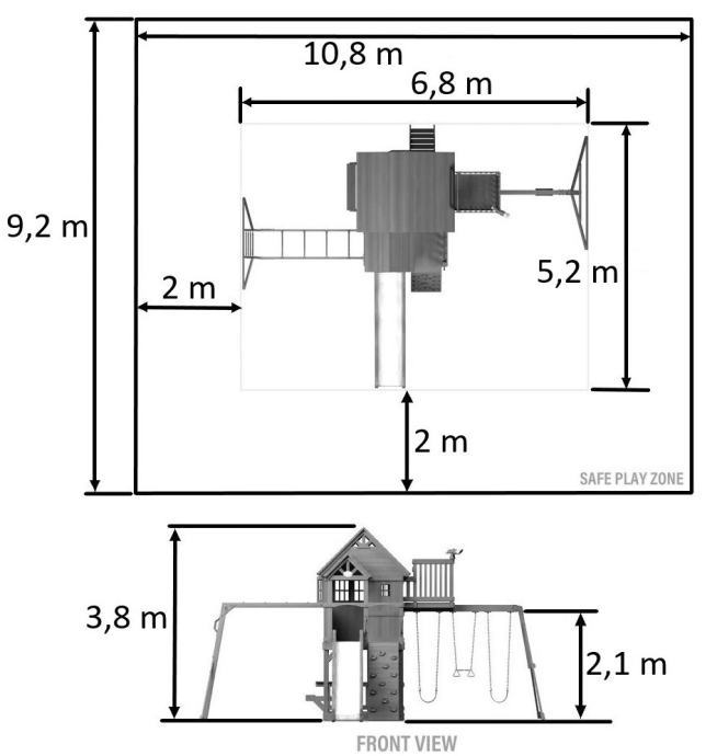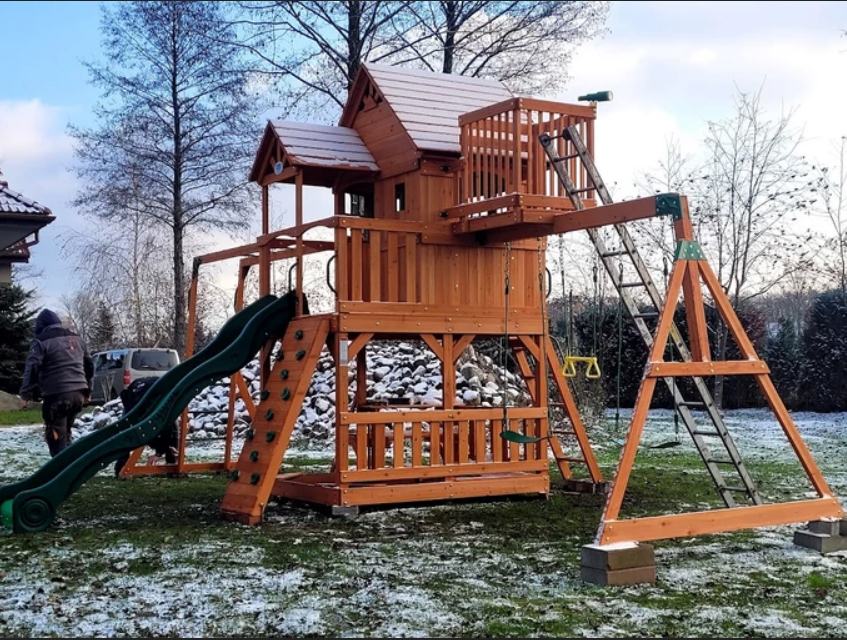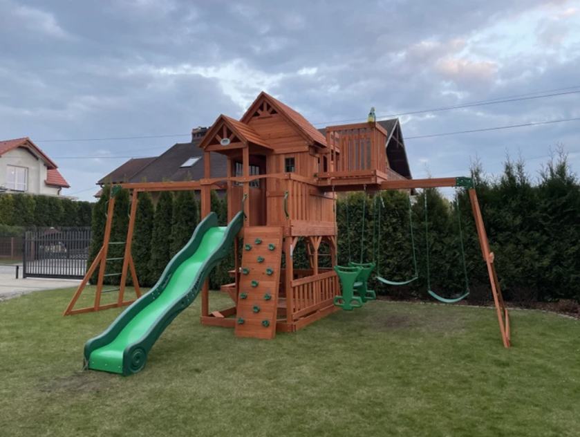 Prednosti:Ovo igralište potiče dječju maštu! Um mališana lako ga pretvara u brod za vrijeme oluje, dvorac pun vitezova i dvorskih dama ili slatki kafić. Opremljena je natkrivenom blagovaonicom (sa stolom i klupama) i zvjezdarnicom s teleskopom. Glavni dio građevine je kula s malim trijemom, prozorima i dvovodnim krovom. Ovaj model također ima ljestve, zid za penjanje i nasad majmuna za poticanje dječje vježbe. Valoviti tobogan vodi prema dolje i ima 3 zamaha u stranu - dva jednostruka i jedan dvostruki tobogan. Cijeli je stabilan i potpuno siguran za djecu. Ima set ručki i ojačanja. Materijali: Struktura igrališta u potpunosti je izrađena od cedrovine, koja je prirodno vrlo izdržljiva i otporna na truljenje. Dobro je znati! Cijelu stvar je lako sastaviti sam. Stupovi su izrađeni od pravokutnog drveta poprečnog presjeka 76 x 76 mm