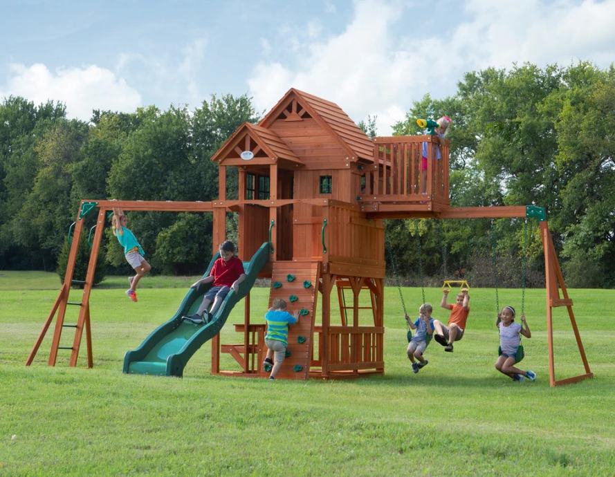 Od borbi sa zmajevima do čajanki, kula za igru s ljuljačkama, trapezom, toboganom, penjalicom i vidikovcem potaknut će maštu vaše djece i vaš krajolik. Sa svojom suncem okupanom klupskom zgradom, prostranom verandom i gnijezdom za vrane, zajedno s vlastitim teleskopom, ovo visoko igralište osjećat će se kao vlastiti drveni dvorac. Postoji mnogo zabavnih i sigurnih načina za kretanje po ovoj osobnoj palači: puna dužina šipki za majmune vodi ih ravno u povišenu klupsku zgradu, izazovan kameni zid omogućuje vam da se popnete izravno na trijem i nizbrdicu od 12 stopa (305 cm) dugo klize natrag niz valoviti tobogan. Trebate odmor od zaštite tvrđave? Sjednite na opuštajuću ljuljačku ili prezalogajite za stolom za piknik. Onda je vrijeme da ponovno vladate kraljevstvom!