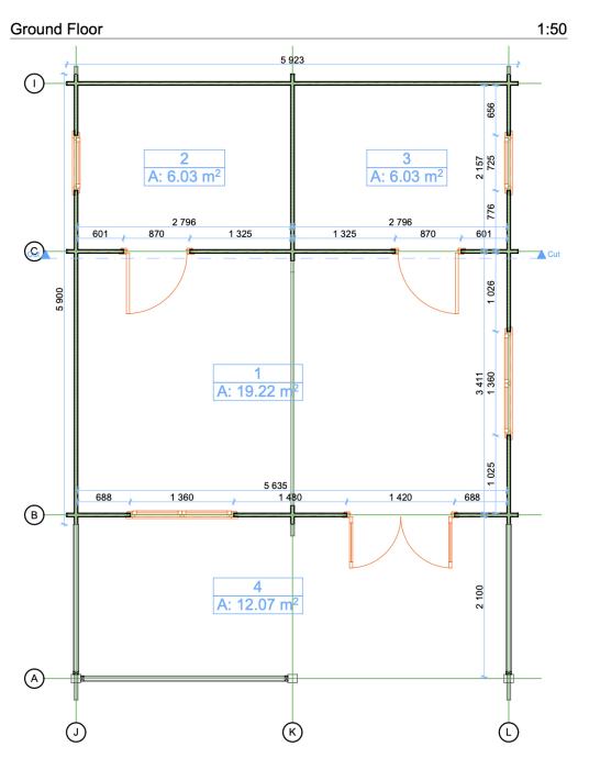 GL 16A je drvena kuća od nordijske smreke od 31 m² korisnog prostora, s udobnim terasom od 12 m².