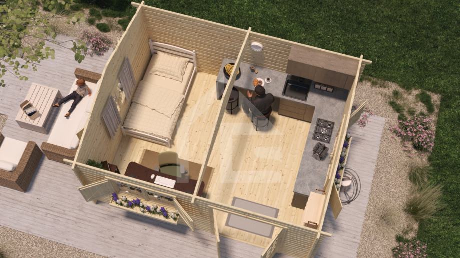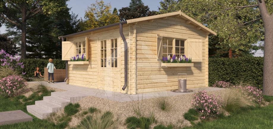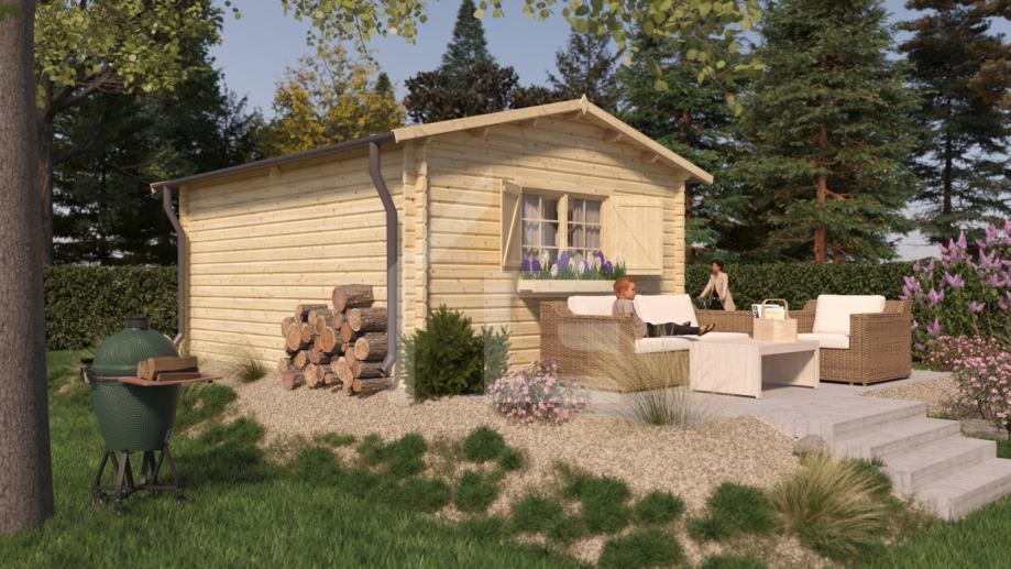 To je funkcionalna drvena kućica za postavljanje u vrtu. Ona ima 17 kvadrata korisne površine.