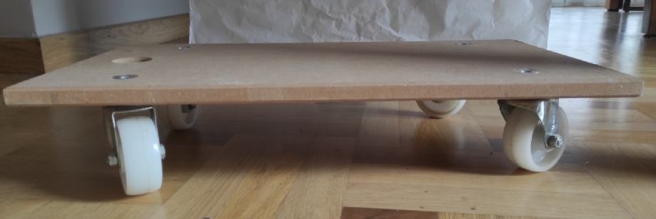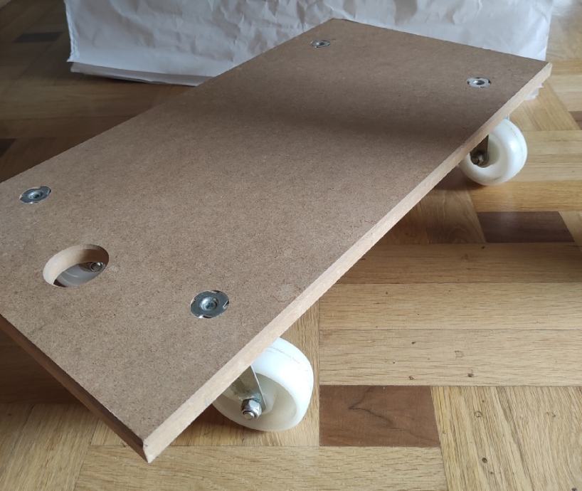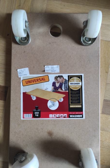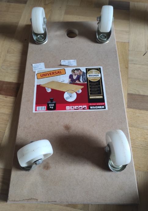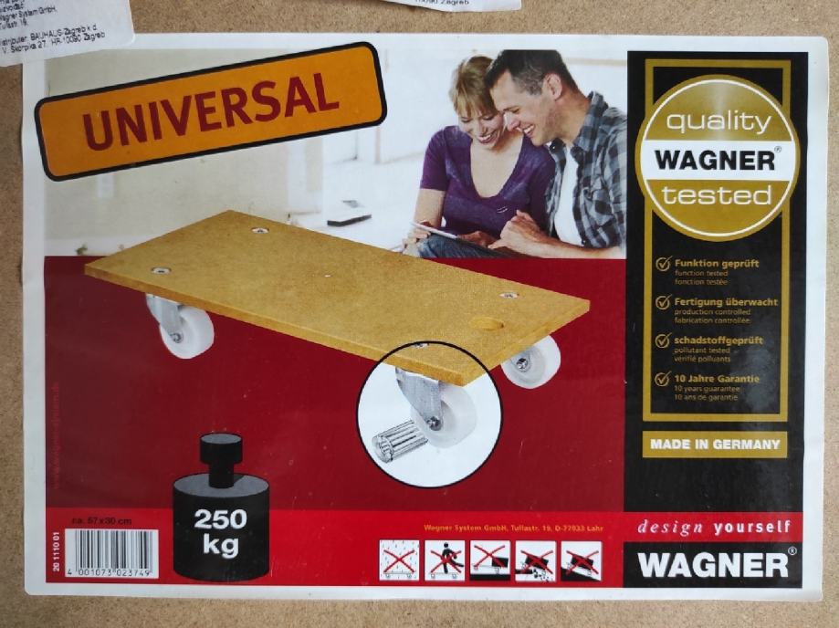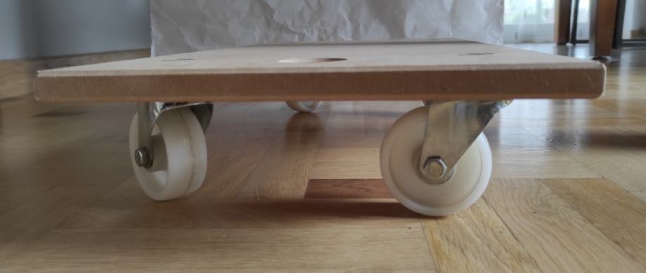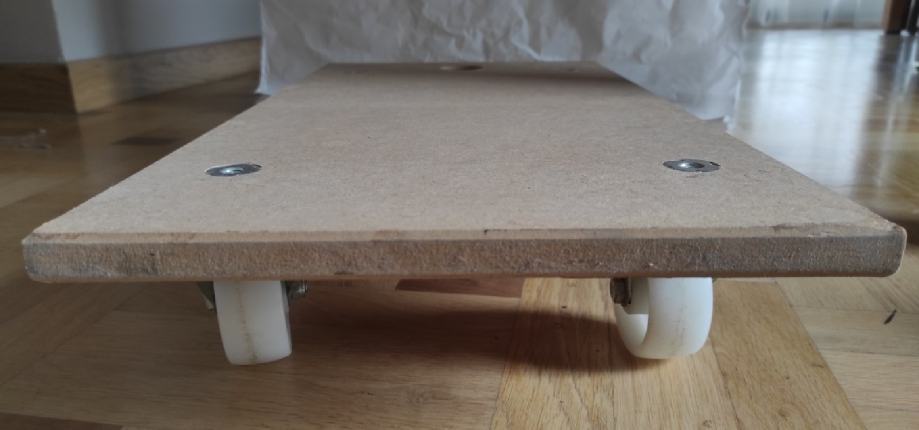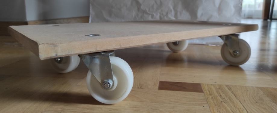 Drveni transportni podložak sa kotačićima Wagner. Plastični mekani 360° okretni kotači pogodni za korištenje na tepisima i pločicama. Malo korišten, potpuno ispravan i očuvan.