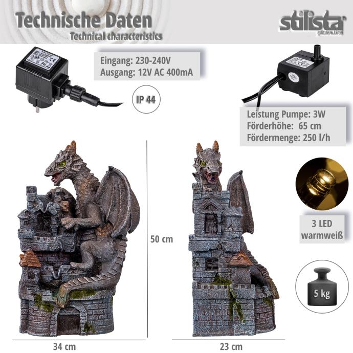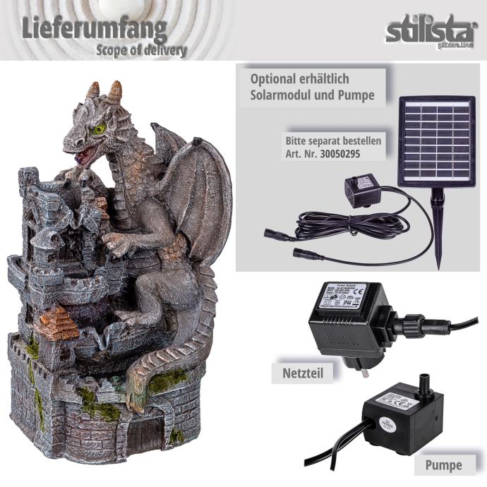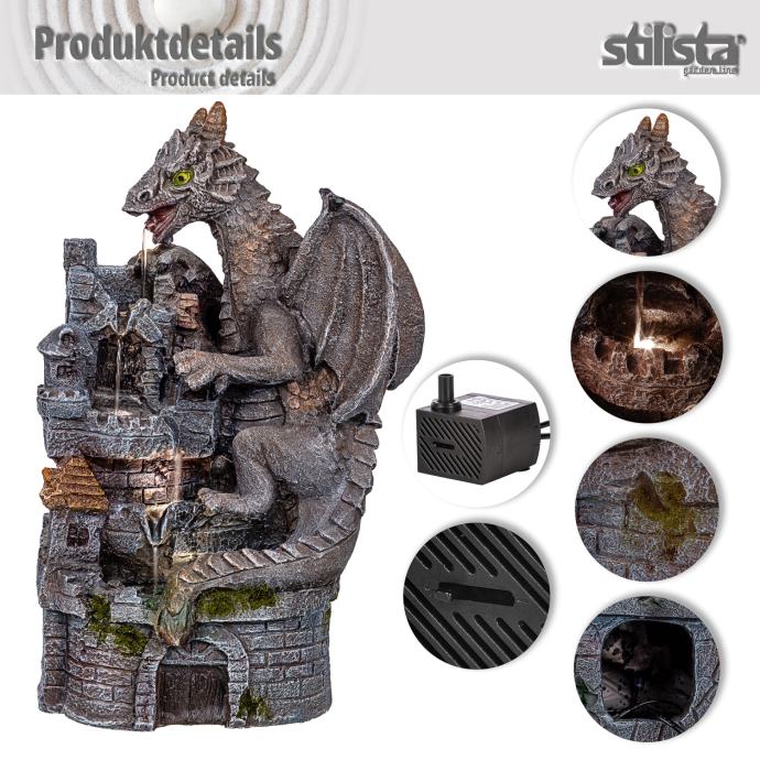 Ukrasna fontana STILISTA “Dragon” izrađena je od visokokvalitetnog poliresina otpornog na vremenske uvjete i UV zračenje. Zahvaljujući osvjetljenju, fontana pretvara vaš vrt ili terasu u oazu blagostanja. Zahvaljujući tihoj pumpi za vodu, voda teče kružno, što znači da nema potrebe za priključkom vode na vrtnu fontanu. Opseg isporuke uključuje beskonačno podesivu pumpu, tako da možete jednostavno prilagoditi količinu isporuke vrtne fontane.