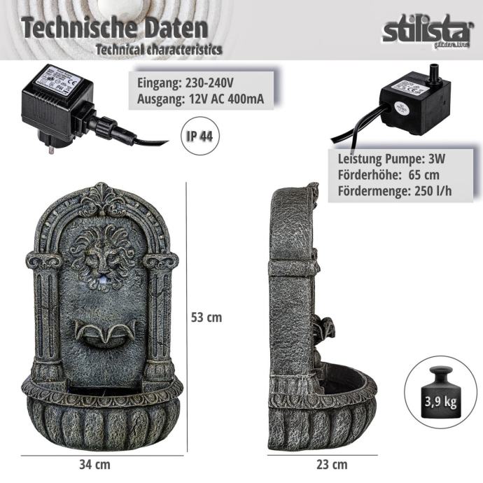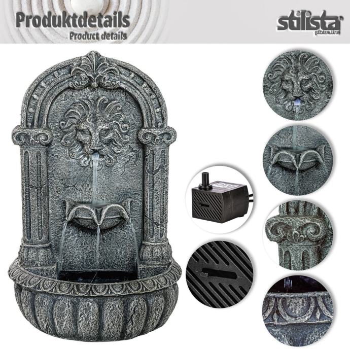 STILISTA ukrasna fontana "Lavlja glava" izrađena je od visokokvalitetnog poliresina otpornog na vremenske uvjete i UV zrake. Zidna fontana pretvara vaš vrt ili terasu u oazu blagostanja. Zahvaljujući tihoj pumpi za vodu, voda teče kružno, što znači da nema potrebe za priključkom vode na vrtnu fontanu. Opseg isporuke uključuje beskonačno podesivu pumpu, tako da možete jednostavno prilagoditi količinu isporuke vrtne fontane.