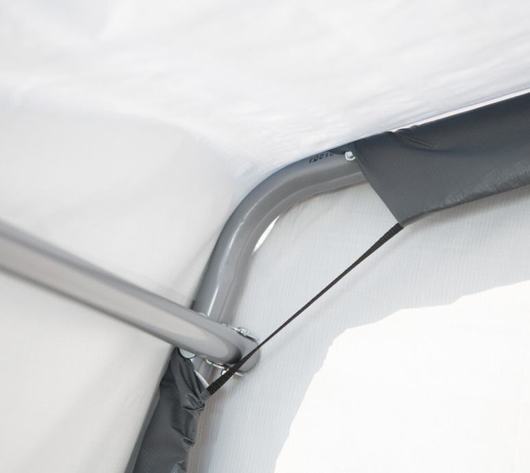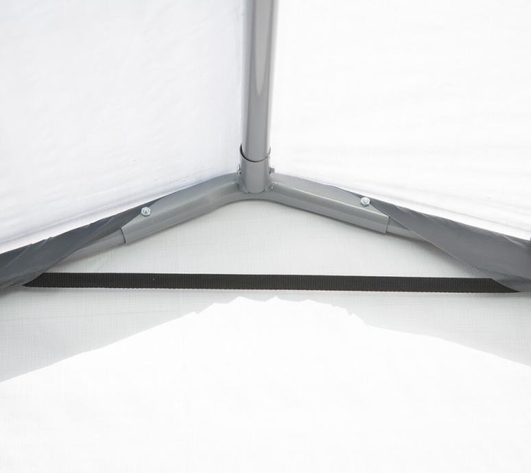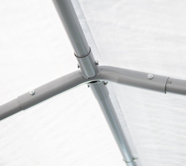 Visokokvalitetna, stabilna cerada od polietilena (160 g/m²) otporna je na UV zračenje i potpuno je vodootporna zahvaljujući posebnoj brtvi i bešavnoj obradi. Čvrsti i dodatno presvučeni čelični okvir debljine 3,5 cm otporan je na hrđu i potpuno otporan na vremenske uvjete. To osigurava dug radni vijek. Patentirani stabilizatori (ShelterLogic® 3X Steel Stabilizers) osiguravaju da je konstrukcija 3x fleksibilnija.