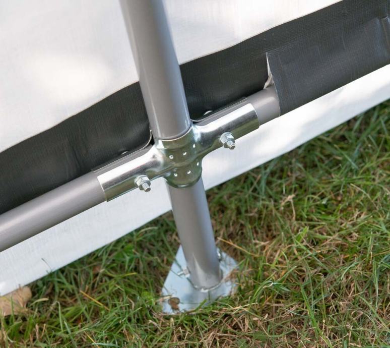 U vrata su ugrađena 2 patentna zatvarača i gumice za kopčanje. Ojačana stražnja stijenka pruža dodatnu stabilnost. Trake za pričvršćivanje (8 komada) osiguravaju sigurno pričvršćivanje cerade na okvir. Uključena su i 4 sidra (38 cm) za sigurno pričvršćivanje na tlo. Nije potreban temelj.