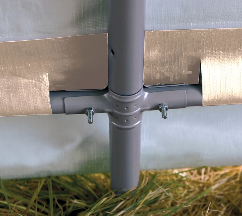 Visokokvalitetna polietilenska cerada (210 g/m²) otporna je na UV zračenje i potpuno je vodootporna zahvaljujući posebnoj brtvi. Čvrsti čelični okvir od 3,5 cm s vrhunskim premazom sprječava hrđu i osigurava dug radni vijek. U ulaznom dijelu nalaze se vrata (ŠxV 150x130cm) sa 2 patentna zatvarača i gumicama za kopčanje.