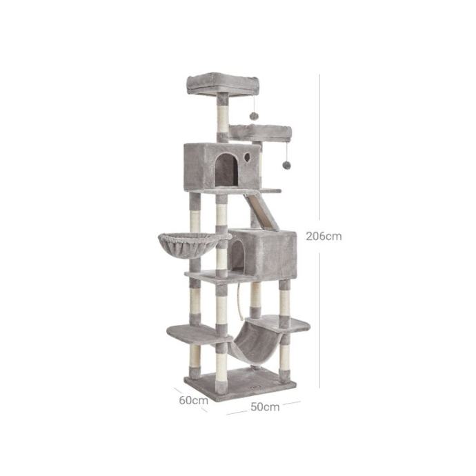 Na sofi? Nedovoljno visoko. Na vrhu ormara? Nije baš ugodno. Ovaj stup za grebanje visok 206 cm? Upravo savršen! Vaša kraljevska mačka može sjediti na platformama za promatranje iznad i paziti na sve! Obilazak sobe za mačke: Prizemlje: igralište za mačke. 1. kat: viseća mreža za opuštanje. 2. kat: dnevni boravak kao spavaća soba i ležaljka. 3. kat: još jedna spavaća soba. A što gore? Znate, prijestolja. S pojačanom baznom pločom za dodatnu stabilnost i zaštitom od prevrtanja za dodatnu sigurnost, ovo mačje stablo je jako pa vaša maca može skakati uokolo. Vaša je sofa teško stradala od nemirnih kandži? Ne brini! Stupići na svakoj razini grebalice omotani su sisalom, tako da je vaša sofa pošteđena kandži vašeg dragog. Razmazite svoje mačke ovom grebalicom kako se ne bi osjećale usamljeno kad ste daleko od kuće, mogle bi se veselo igrati i opustiti u udobnosti. Za sve informacije nazovite na broj telefona 092/399-75-19