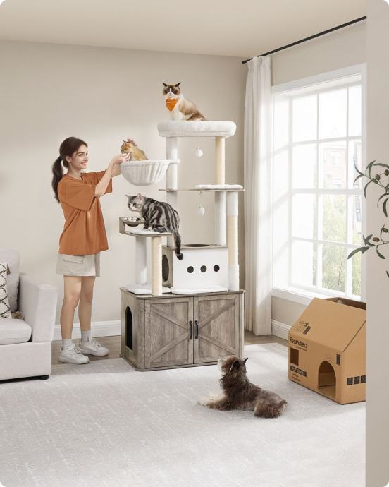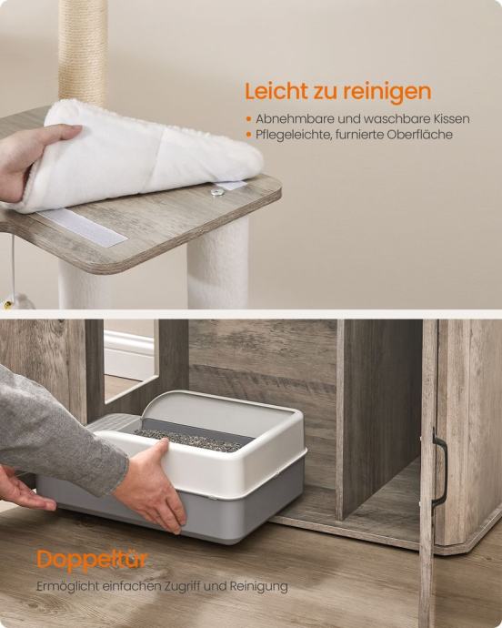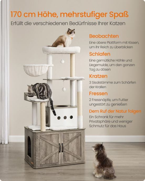Penjanje, opuštanje, jelo, odgovaranje na poziv prirode, spremanje pribora za mačke - nema problema! S ormarićem za pijesak, zdjelicama za hranjenje i nekoliko udobnih mjesta, grebalica osigurava sretan život životinja. Razmazite svog krznenog prijatelja super mekim jastucima od 500 g/m² pliša. Pružaju sigurnu, protukliznu površinu po kojoj se vaša mačka može penjati. Osim toga, uklonjivi jastuci mačjeg stabla lako se čiste. Ne treba vam dodatni ormar za pohranjivanje mačjih stvari. Donji ormarić prikladan je za pohranu hrane za mačke, stelje itd. Jednostavno zatvorite vrata kako biste ga zaštitili od znatiželjnih šapa. Ovaj stup za grebanje za mačke visok 170 cm pruža okomito igralište za vaše profesionalce u penjanju. Prostrana jazbina i platforma pružaju mačkama različitih veličina udobno mjesto za opuštanje. Povišene zdjelice postavljene su visoko tako da ni psi nemaju šanse doći do njih! Izrađene od nehrđajućeg čelika 304, zdjele su sigurne i izdržljive, a nagib od 10° smanjuje napor na vratu vaše mačke. Za sve informacije nazovite na broj telefona 092/399-75-19