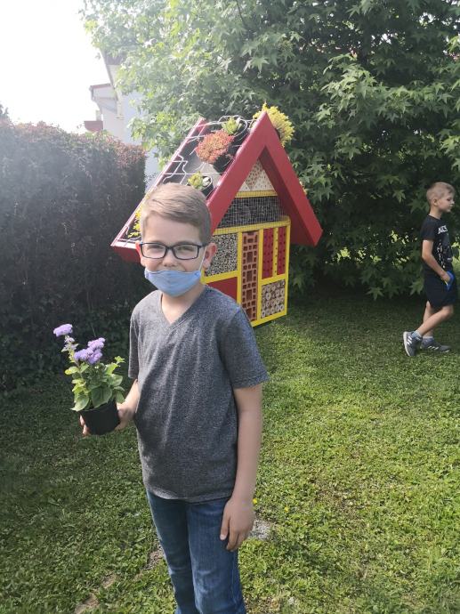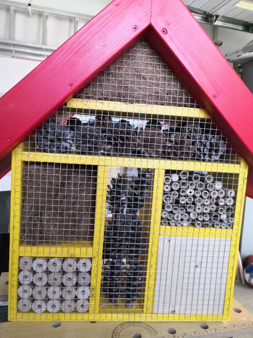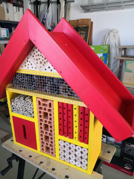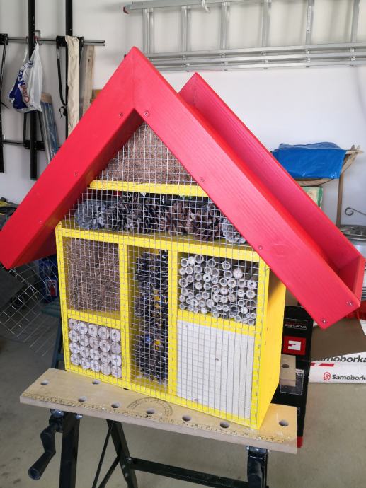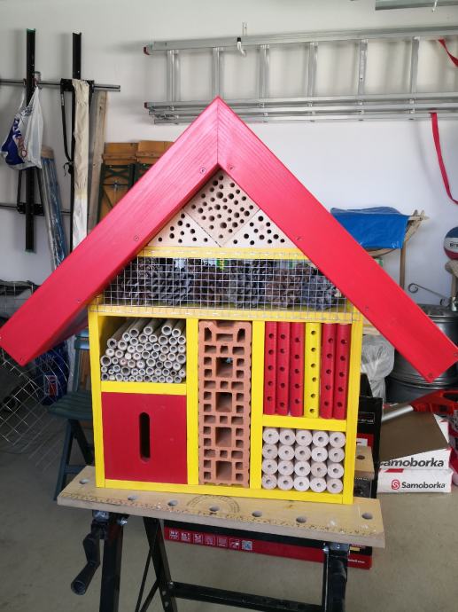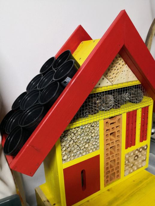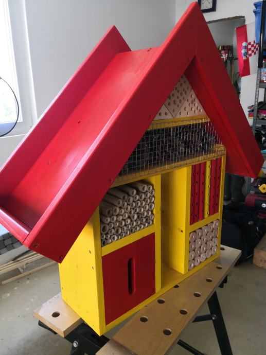 Hotel za kukce š/v/d 50/70/29 izrađen od prirodnih materijala ( drvo, bambus, češeri, terakota), obojan eko bojama pogodan za vrtove i parkove. U krov hotela mogu se instalirati tegle sa trajnicama ili trajnice samo u zemlju