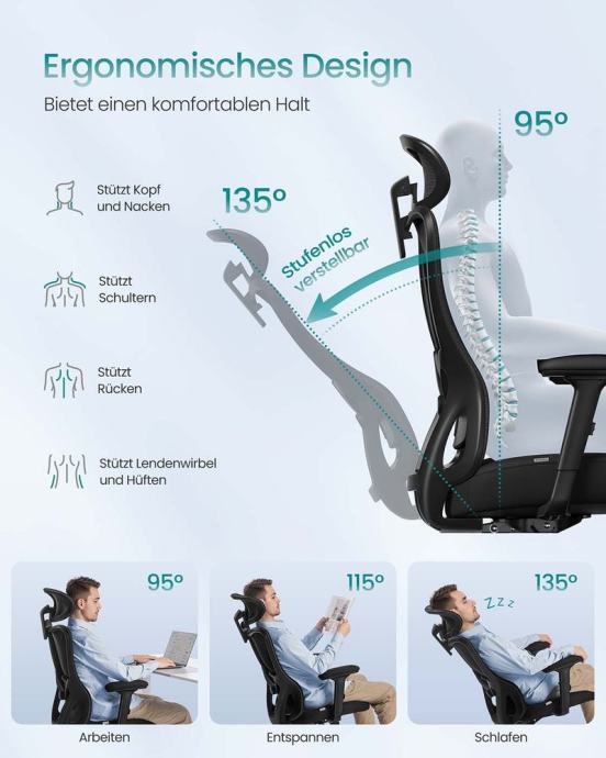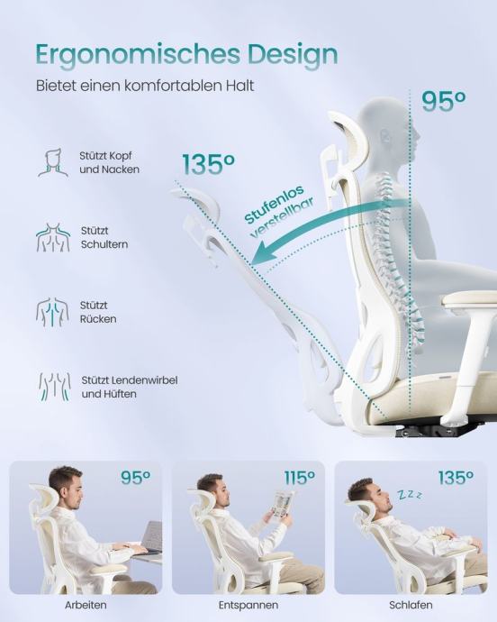Ergonomski naslon: Naslon u obliku slova S savršeno se prilagođava vašem tijelu i podesiv je između 95° i 135°. Želite li raditi, opustiti se ili odmarati, možete pronaći idealan položaj.