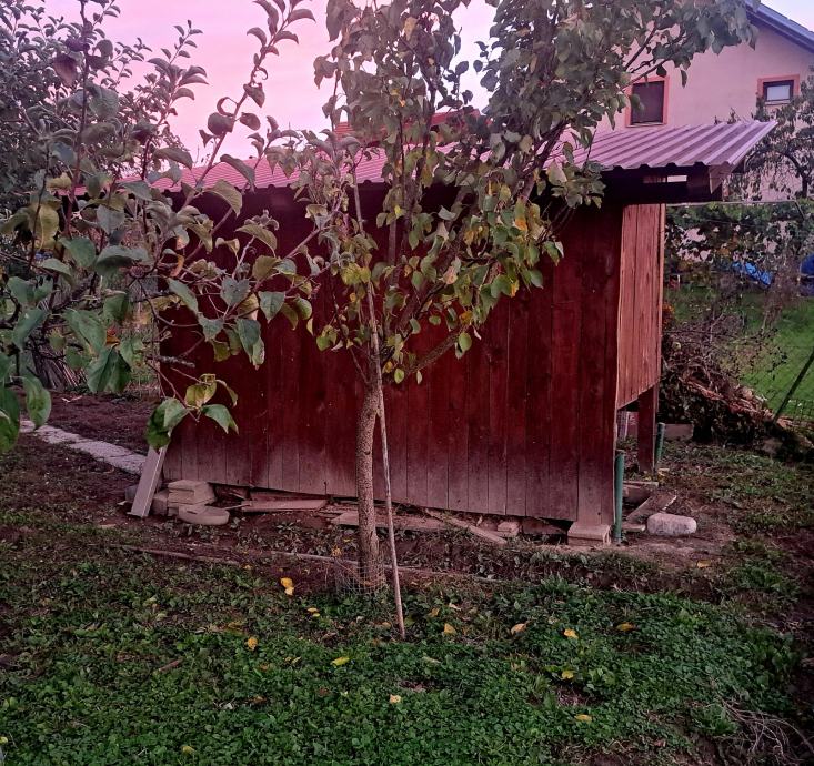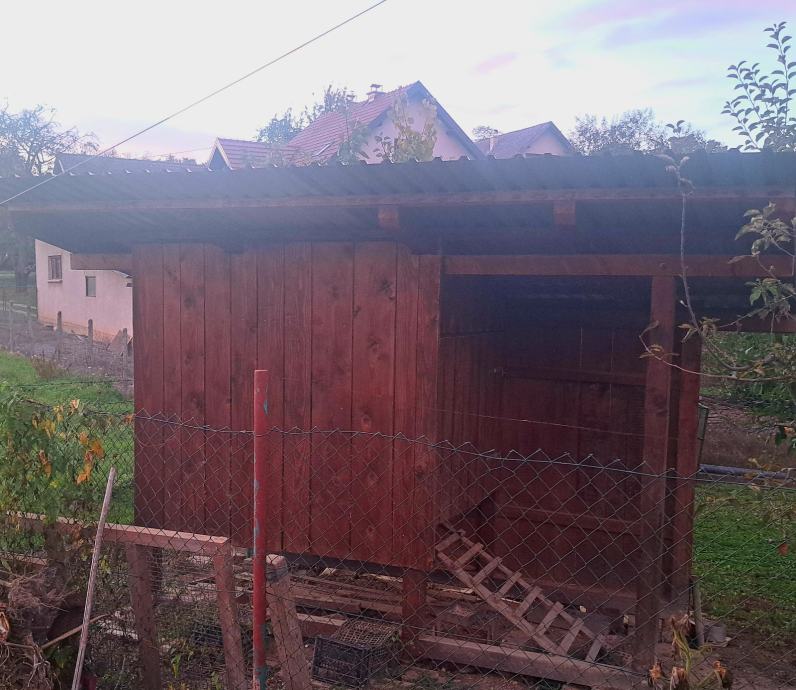 Drveni (prenosivi) kokošinjac, izrađen masivno od daski debljine 3cm, pokrov cinčani plastificirani trapezni lim, tlocrtno 3 x 4 m, zatvoreni prostor cca 2,40 x 2 m, zimska+ljetna vrata.