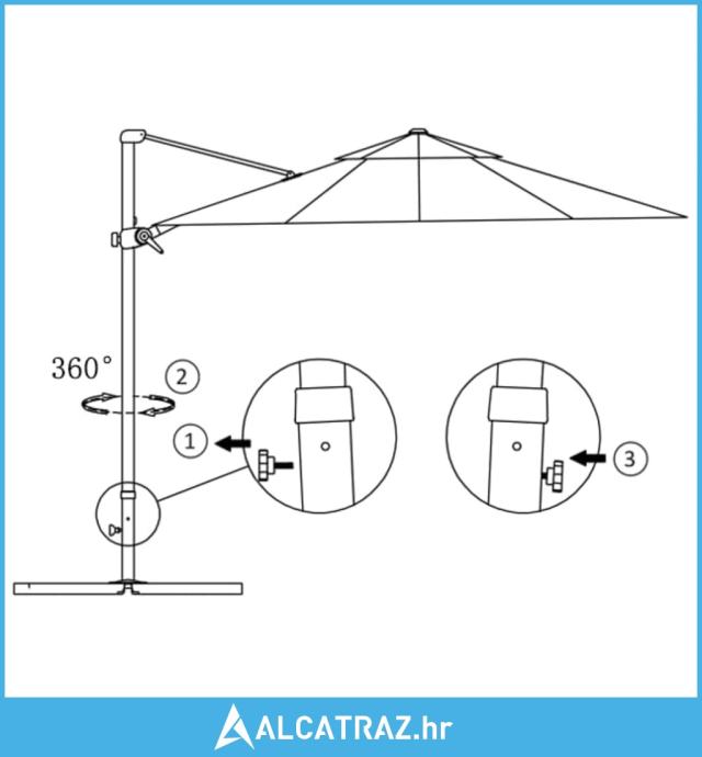 Napravljen od poliestera, koji štiti od UV zračenja i ne blijedi, pokrov suncobrana pruža vam najbolju zaštitu od sunca i lako se čisti. Ima čvrstu križnu bazu za dodatnu stabilnost. Ekskluzivni dizajn ovog suncobrana omogućuje vam naginjanje suncobrana za 360 stupnjeva kako biste blokirali sunce. Čvrsta aluminijska šipka, zajedno s 8 izdržljivih nosača, čini suncobran vrlo stabilnim i izdržljivim. Naš vrtni suncobran može se lako otvoriti i zatvoriti zahvaljujući mehanizmu s ručicom. Ovaj artikal lako se sastavlja.