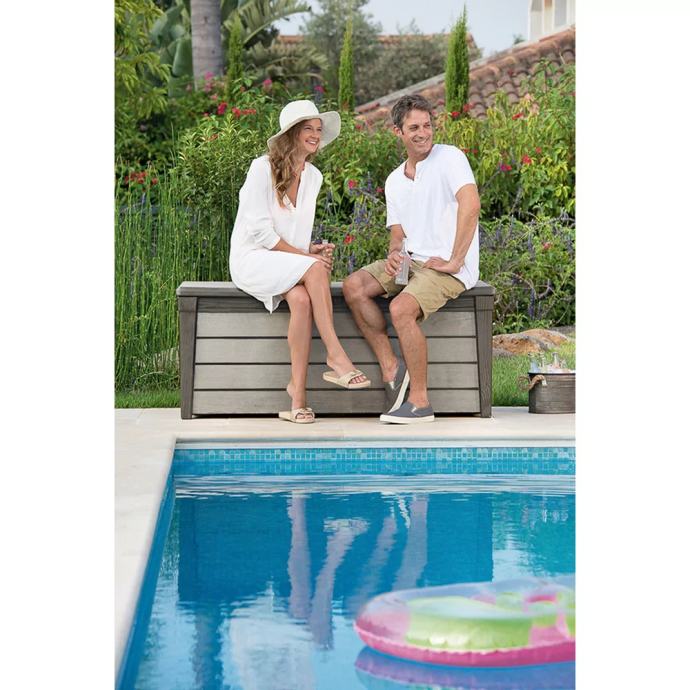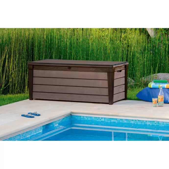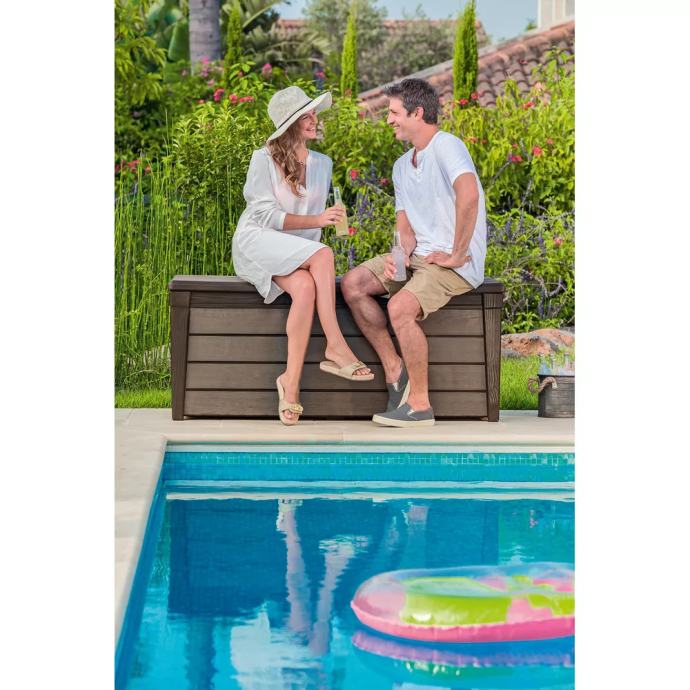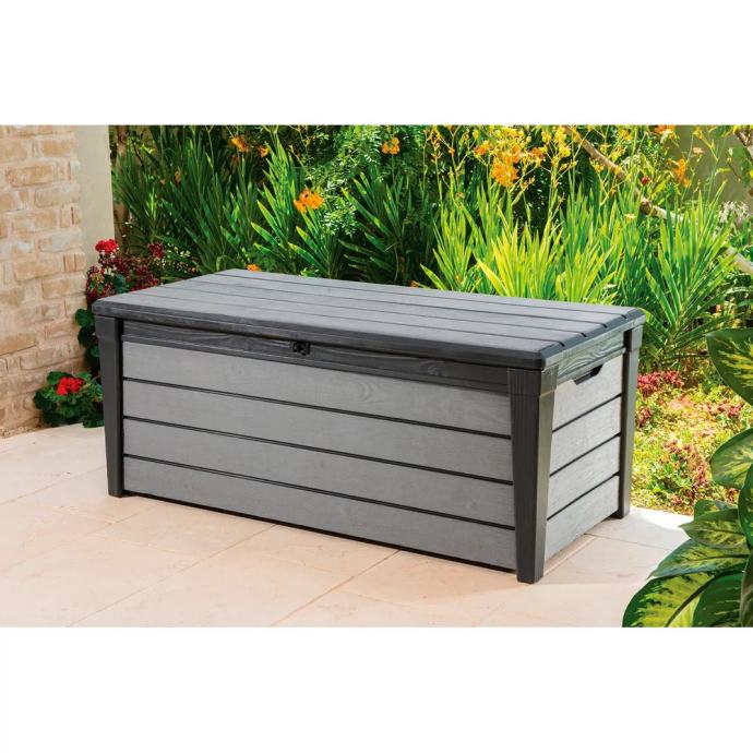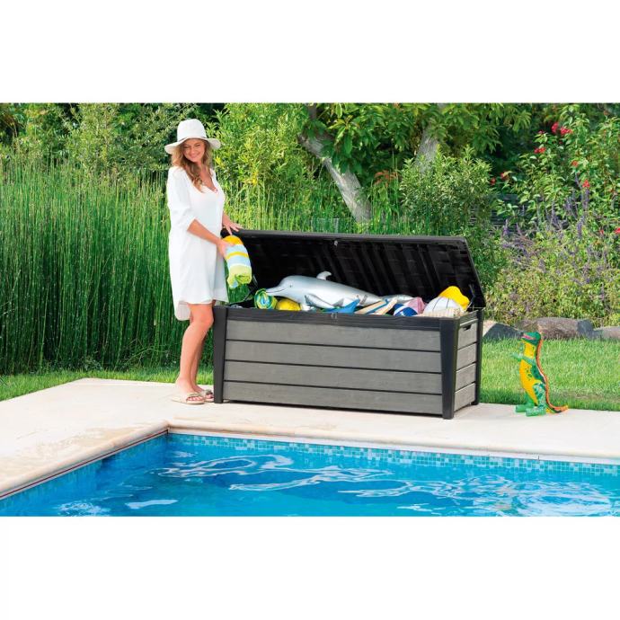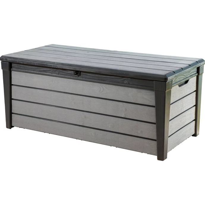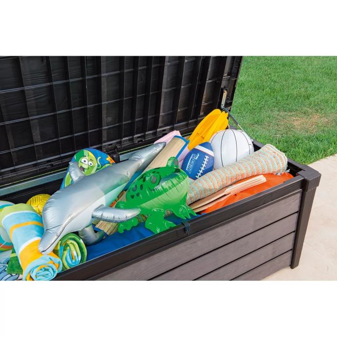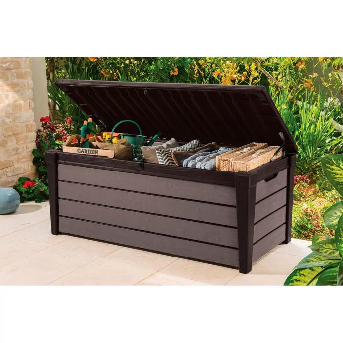 Veća plastična kutija s 455L prostora za odlaganje. Kutija za odlaganje omogućuje vam prikladno spremanje svega što želite pri ruci u svom vrtu. Karakterizira ga veliki kapacitet, zahvaljujući kojem može stati, na primjer - u vrtni alat, jastuke ili pokrivače. Njegova je instalacija vrlo jednostavna i ne zahtijeva posebne alate. Mehanizam koji olakšava otvaranje poklopca nesumnjivo je velika prednost proizvoda.